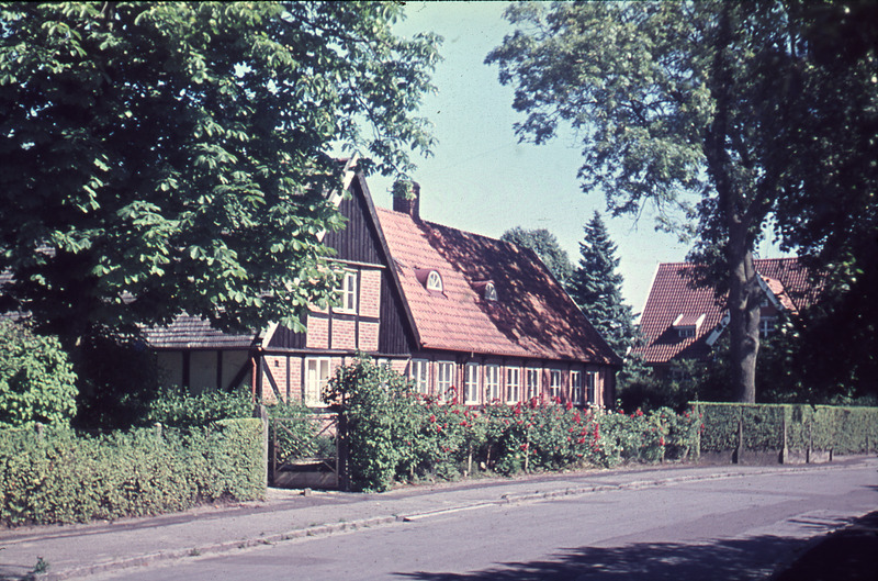 blomma; buske; byggnad; gata; hus; häck; korsvirke; trottoar; träd; växt