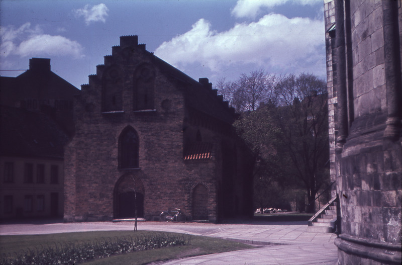 byggnad; cykel; gräsmatta; hus; kapell; stadsbebyggelse; trappa; träd