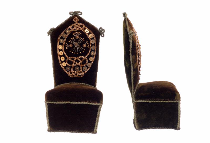 Vårt dockskåps historia. Dockskåpet var julen 1865 en julklapp till de två systrarna Alma och Judith Gegerfelt, och i sinom tid blev de yngre systrarna Hildur och Adéle också delägare där. Det är antagligt att själva skåpet först tillkommit och att då möblering skulle företagas, det ej varit möjligt att genom köp införskaffa tillräckligt antal möbler i lämplig storlek. Följden var att en del måste tillverkas och min mor utförde med tillhjälp av snickare Landgren detta arbete. Ganska säkert är att hon härvid drog sig till minnes vad hon under sin ungdom så många gånger sett på herrgårdarna i hemtrakten, hörnsoffan i salongen vittna bland annat härom, och ävenså har nog modellerna till de två kristallkronorna sitt ursprung från detta håll. (Text ur brev i byrå i dockskåpet, fortsätter nedan); Vårt dockskåps historia, forts. Salongen befinner sig nu i huvudsak i samma skick som då den inreddes och detta är även förhållandet med det under denna till höger belägna, förmaket eller damrummet då däremot det till vänster fått en helt annan utstyrsel. Ursprungligen sängkammare, blev det då dockskåpet år 1897 skulle överlämnas till Ingeborg Winther, Judiths dotter, apterat till herrum och möblerat efter tidens sed, varvid min mor och jag voro både tapetserare och målare. Ingen som gjorde anspråk på att äga självaktning på 1890-talet vid inredning av ett herrum underlåta att med möblemanget införliva en turkisk divan, och en dylik ingick som synes också i den vi åstadkommo. Vi voro nog rätt så belåtna med interiören i sin helhet och kan den må hända i inte egentlig mening betecknas såsom ful ehuru den med sina tillskott av tofsar och fransar här vittna om en efter våra dagars uppfattning förkastlig för att inte säga föraktlig smakinriktning. Sängkammaren förflyttades till rummet direkt under och fick endast ett par nyförvärv, redan den med undantag för sängen, som ursprungligen blott var en bedräglig uppställning av en uppbäddad sådan. Olämplig tyckte vi, att nu anbringa emedan den presenterar sig ungefär som från början. Det bredvid liggande köket blev under vårt regemente så småningom skattat på mobilierna, vilka praktiskt utnyttjades utanför den för dem avsedda lokalen, och då dockskåpet kommit i Ingeborg Winthers händer, inköptes och installerades däri år 1899 ett matrumsmöblemang till vilket ju hörde den då men numera icke önskvärda buffen. Jag tror ej att dockskåpet någonsin definitivt övergått till Viveka Håkanson, Ingeborgs dotter. Säkerligen ansågs det vara hennes, då hon blev stor nog att laga det i bruk, i varje fall är hon inom vår familj den sista ägarinnan därav. (Text ur brev i byrå i dockskåpet, fortsätter nedan); Vårt dockskåps historia, forts. Det är naturligt, ja ofrånkomligt att ett dukkehiem som tillhört olika personer av tre generationer icke kunnat förbliva sådant det från byggnaden var, men vi har i alla händelser förfarit med den pietet som gjort sig gällande, och det är ju endast herr och matrum vilka icke förskriva sig från år 1865. Inredningen i dessa har ju dock förefunnits i flera decennier - daterar sig till och med från föregående århundrade och blir väl en gång i världen antik också den. I fråga om mindre saker kan jag med säkerhet endast yttra mig om ett fåtal. Den lilla tallriken med röda blommor som jag placerat ovanpå linneskåpet i matrummet har så långt jag kan minnas tillbaka funnits bland småtingen, även så skålen av mjölkvitt glas som fått sin plats på sybordet i damrummet, björnen i elfenben på skrivbordet där samman städes har kommit från Indien - närmare bestämt från Agra- och de två svanarna på byrån i salongen blev år 1892 med min bror och mig som åsyna vittnen för dockskåpets räkning utförda av en glasblåsare som här i Lund hade en uppvisning av sin skicklighet. Dockherrskapet, som vid första överlämnandet residerade i våningen, har för länge, länge sedan skattats åt förgängelsen, och jag erinrar mig ej mer än en av familjens medlemmar. Antagligen måste denna rubriceras som frun i huset och bilden av henne är för mig så tillvida rätt tydlig. Hon satt på den inre stolen till vänster vid salongsbordet, hade porslinshuvud med guldgult hår benat i mitten och kammat åt sidorna över valkar, och var iförd en vit klänning med struttande kjol av mäktlig vidd. I sanningens intresse måste det bifogas att sittandet var föga illusorisk, i ty att vederbörande var styv som en pinne - en egenskap vanlig hos dockor från denna period - och att håret var i ett med porslinshuvudet....... Text ur brev Januari 1934 av Hildur von Gegerfelt (se uppgiftsboken nr 28).; Sesam packade i Weibullska 1999 två föremål märkta med detta nummer, dessa återfinns dock ej på de äldre fotografierna och finns inte till hands vid inläggningen 2002: Skrivbord, brunmålad, svängda ben, fem lådor, uppepå bordsskivan ett skåp med dörr samt en hylla med bakstycke, förgylld dekor. B:12, Dj:6, H:12,5. Ett skålat fat av vitt porslin med dekor i form av tre små blommor i rosa och grönt. Sprucket. Mått: H 0,6 cm, Diam 3,4 cm.; Föremålet hör till övre salongen.