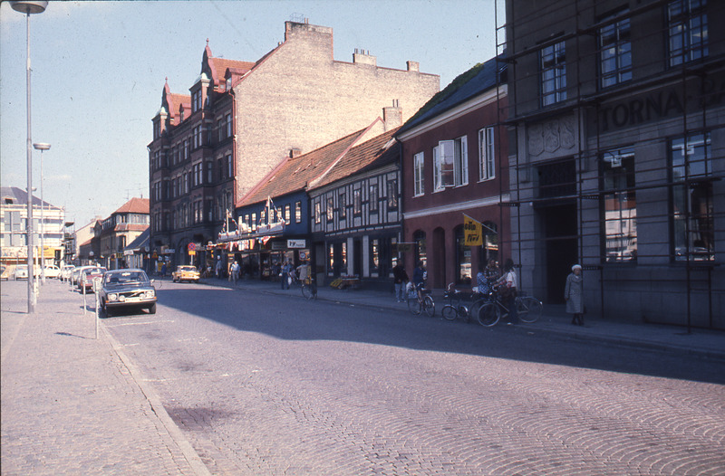 affär; bank; bilparkering; byggnad; byggnadsställning; cykel; gata; hus; korsvirke; kvinna; lyktstolpe; man; parkeringsautomat; person; skylt; skyltfönster; stadsbebyggelse; torg; trottoar; vimpel