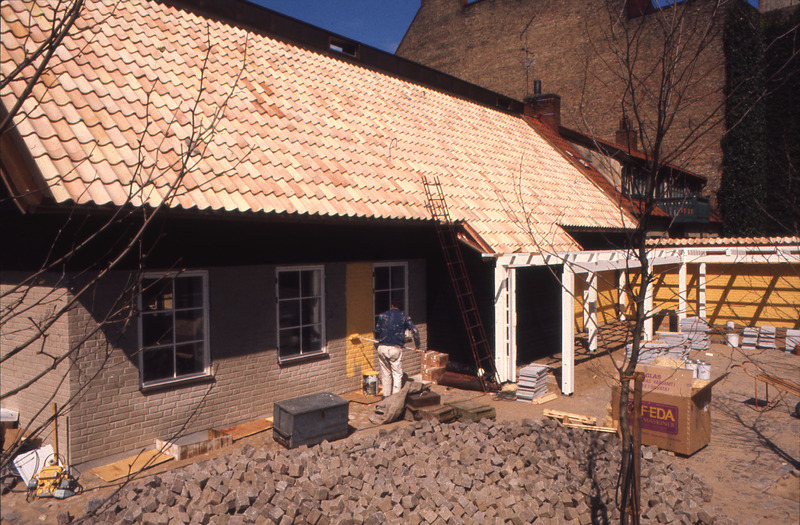 arbetare; arbetsredskap; byggnad; gatsten; hus; mur; pergola; person; stadsbebyggelse; stege; träd