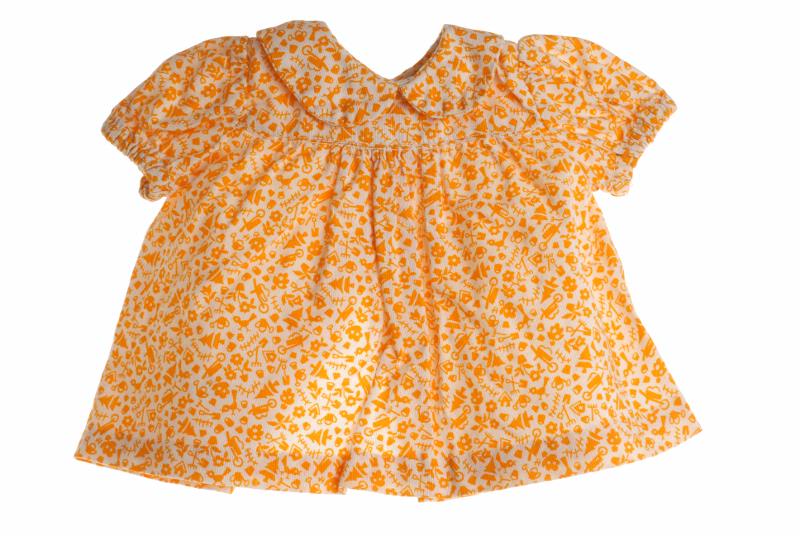 - Vit botten täckt med ett mönster bestående av motiv med granar, fågelholkar, blommor, skottkärror, fåglar, träd, krukor, staket, vattenkannor, spadar och krattor, i orange. Krage med rundade snibbar, OK som kjolen är rynkad mot. Korta puffärmar med resår i slut. Öppen mitt bak, knäpps i okets övre del med två vita knappar. Maskinsydd med handsydda knapphål och fåll. Har ett par tillhörande byxor i samma tyg, KM 86346.