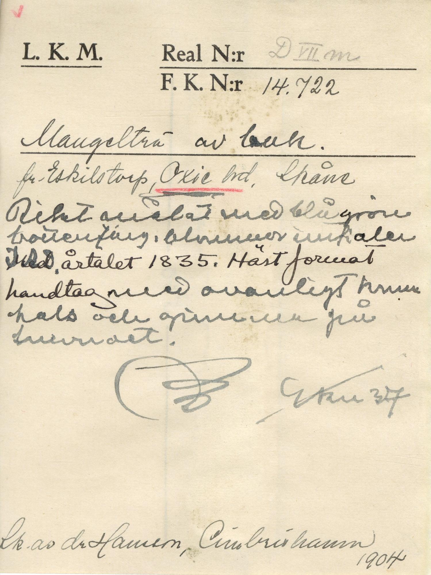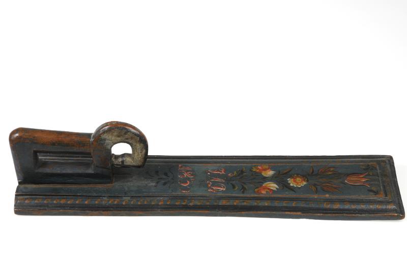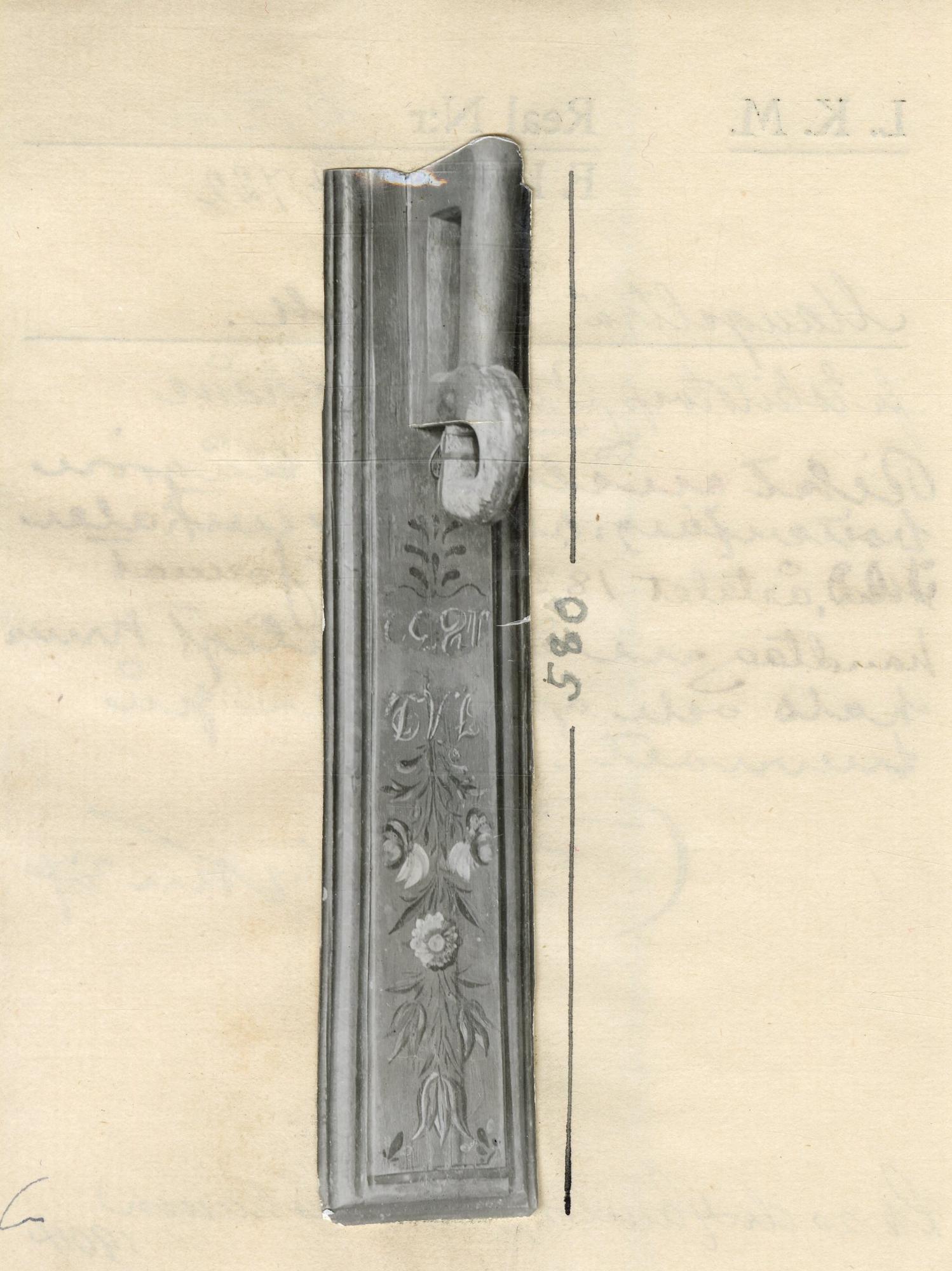 Rektangulärt, mot handtaget avsmalnande. Avfasad, räfflad kant. Högt handtag i hästform, med krum hals och huvud, som vågrätt är böjt in emot handtagets främre parti. Handtaget infällt och fasthållet med tränaglar. Blå bottenfärg, med blomsterranka i mitten med gula, vita och röda blommor. Kanterna svartmålade, med gula punkter. Hals och huvud vitmålade; remtyg svartmålat. I rött och vitt: I.A.D. 1835