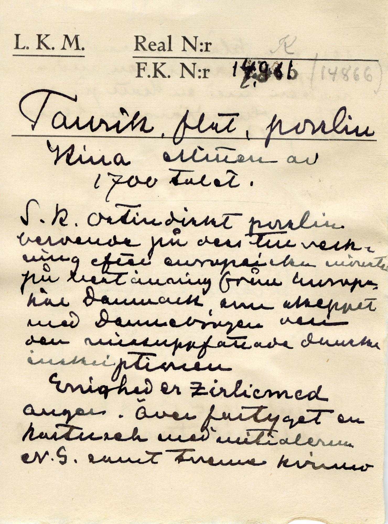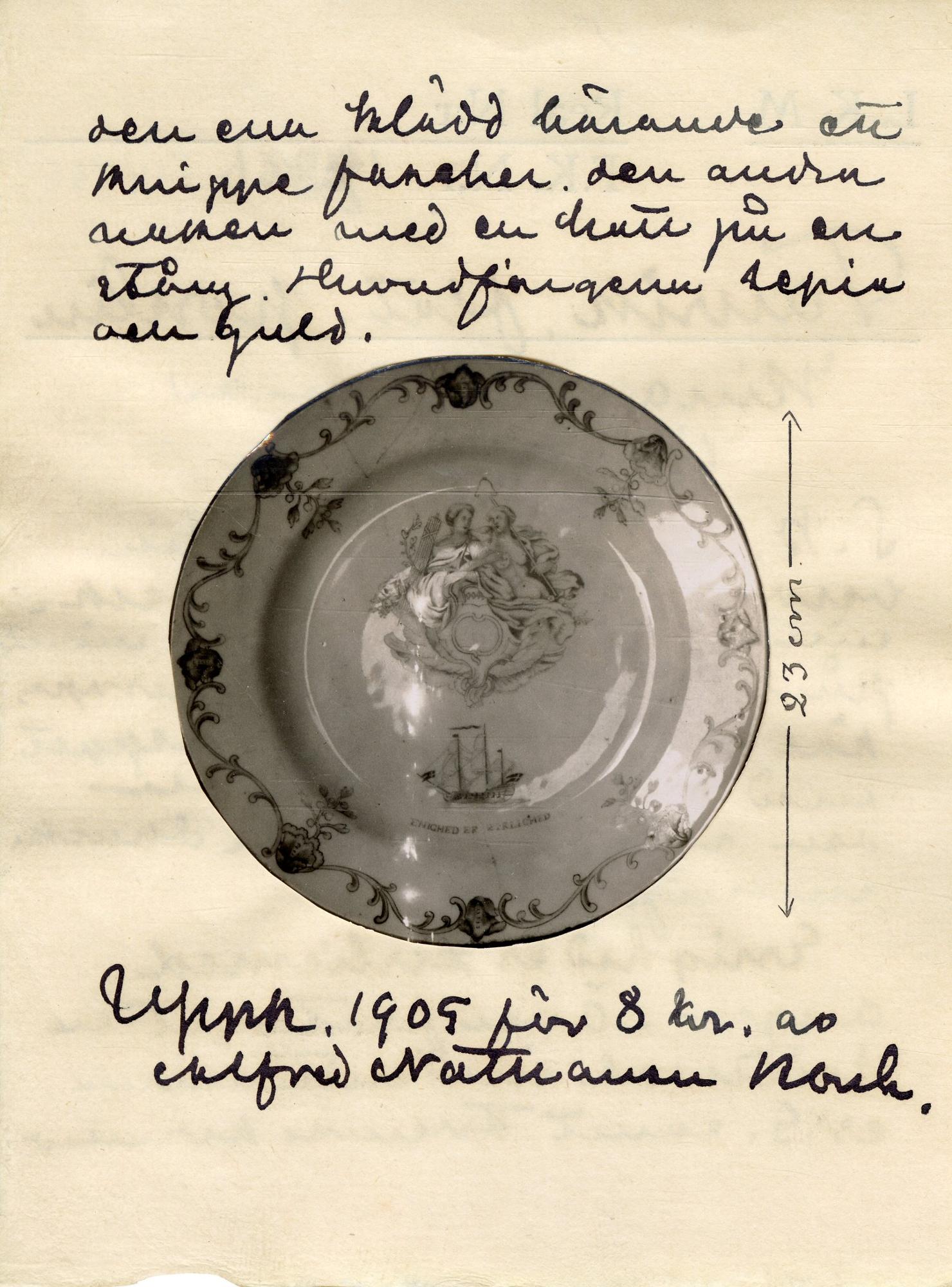 - Rund, flack med lotusformat brätte. Emaljmåleri i rosa och guld mot vit botten. En tallrik, med en människa med krona och treudd på spegeln, brättet med bambuslinga. En tallrik med motiv med dansk ostindiefarare, "Enighed er sirlighet", brättet med guldgirland.