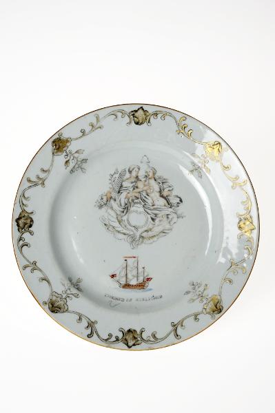 - Rund, flack med lotusformat brätte. Emaljmåleri i rosa och guld mot vit botten. En tallrik, med en människa med krona och treudd på spegeln, brättet med bambuslinga. En tallrik med motiv med dansk ostindiefarare, "Enighed er sirlighet", brättet med guldgirland.