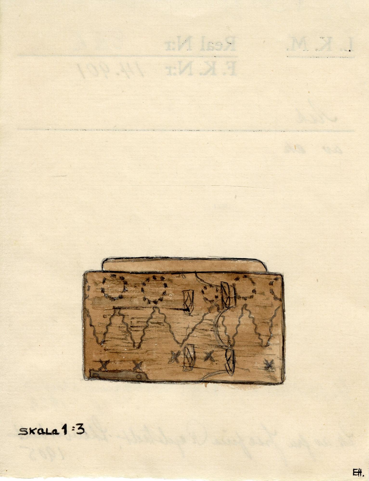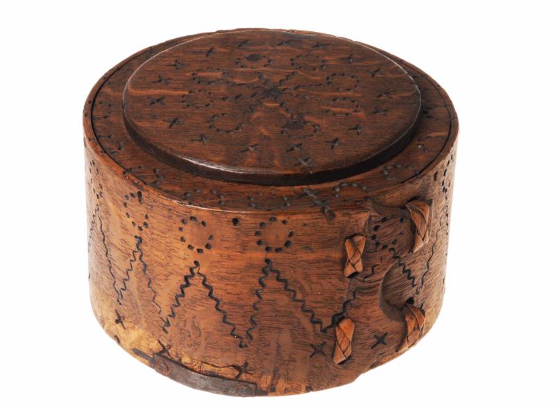 Rund med litet ovanpåliggande lock. Dekorerad med kryss, cirklar, enkla stjärnor och zick-zack mönster. Även dekorerad undertill.