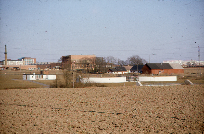 buske; byggnad; elstolpe; fabriksbyggnad; flerbostadshus; odlingsmark; reningsverk; skorsten; stadsbebyggelse; träd; växt