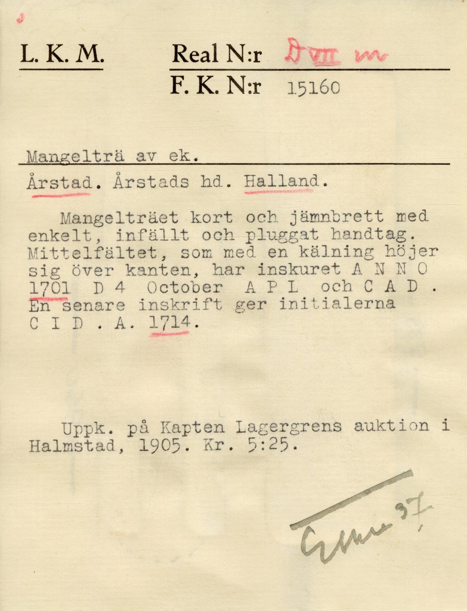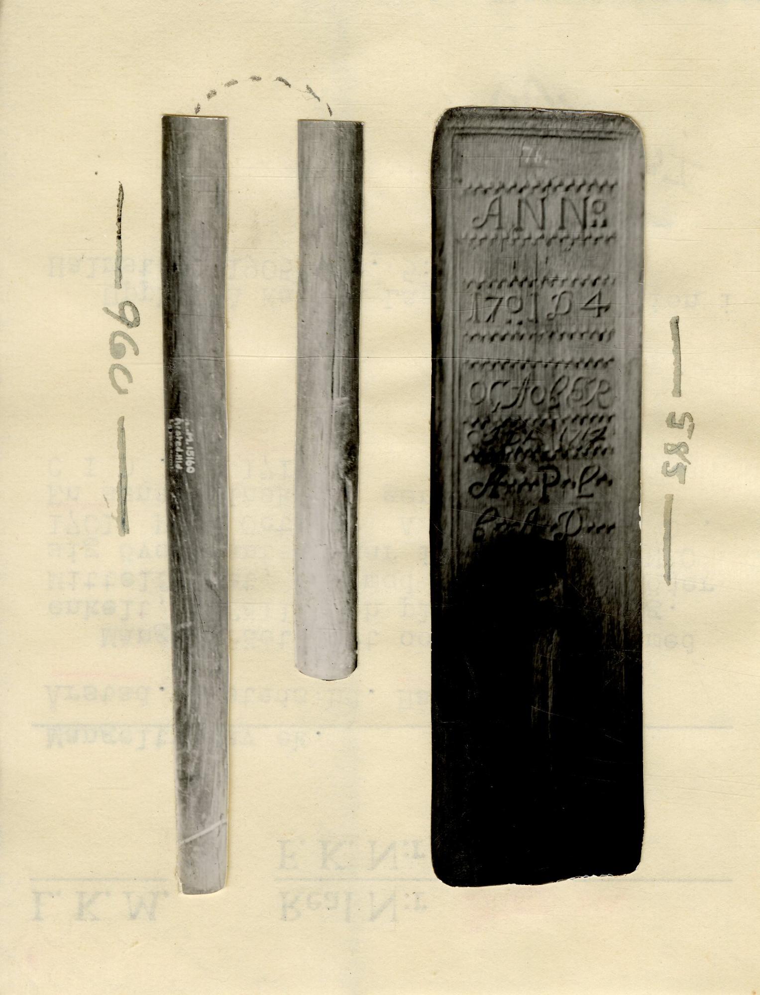 - Rektangulärt, ovanligt kort, av eketrä. Avfasade, räfflade kanter. Enkelt, med tränaglar fastnitat handtag. Inskuret: ANNo 1701 D 4 OCtober. CIDA 1714. A.P.L. CAD. i rader med nagelsnittsdekor. Omålat. Kavel av eketrä, rund ,96 cm lång och med fyra cm i diameter.