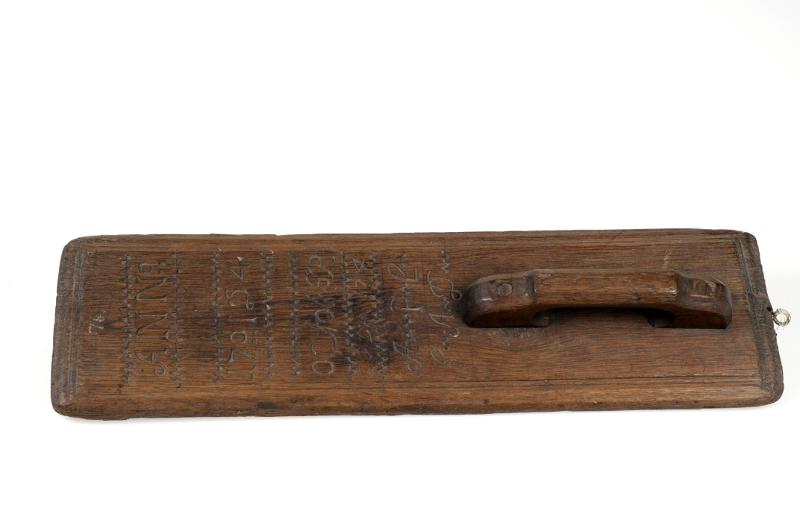 - Rektangulärt, ovanligt kort, av eketrä. Avfasade, räfflade kanter. Enkelt, med tränaglar fastnitat handtag. Inskuret: ANNo 1701 D 4 OCtober. CIDA 1714. A.P.L. CAD. i rader med nagelsnittsdekor. Omålat. Kavel av eketrä, rund ,96 cm lång och med fyra cm i diameter.