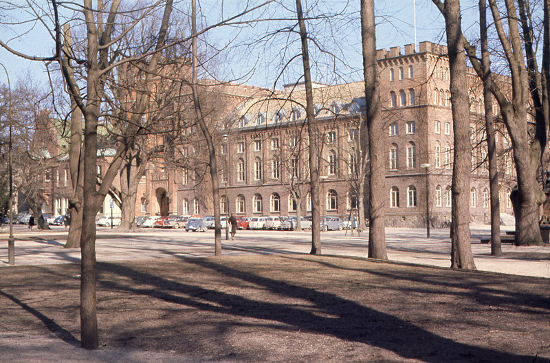 bil; bilparkering; byggnad; gavel; lyktstolpe; park; person; stadsbebyggelse; träd