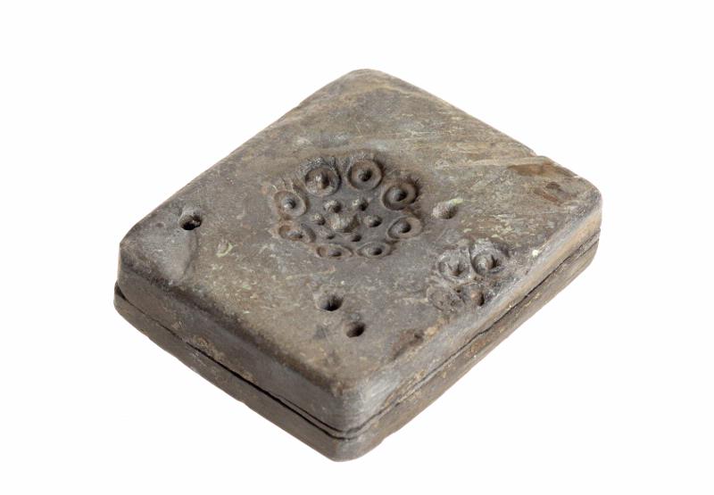 Rektangulär med rundade hörn. Uppe på en halvsfärisk gjutform med mönster av prickar och cirklar.