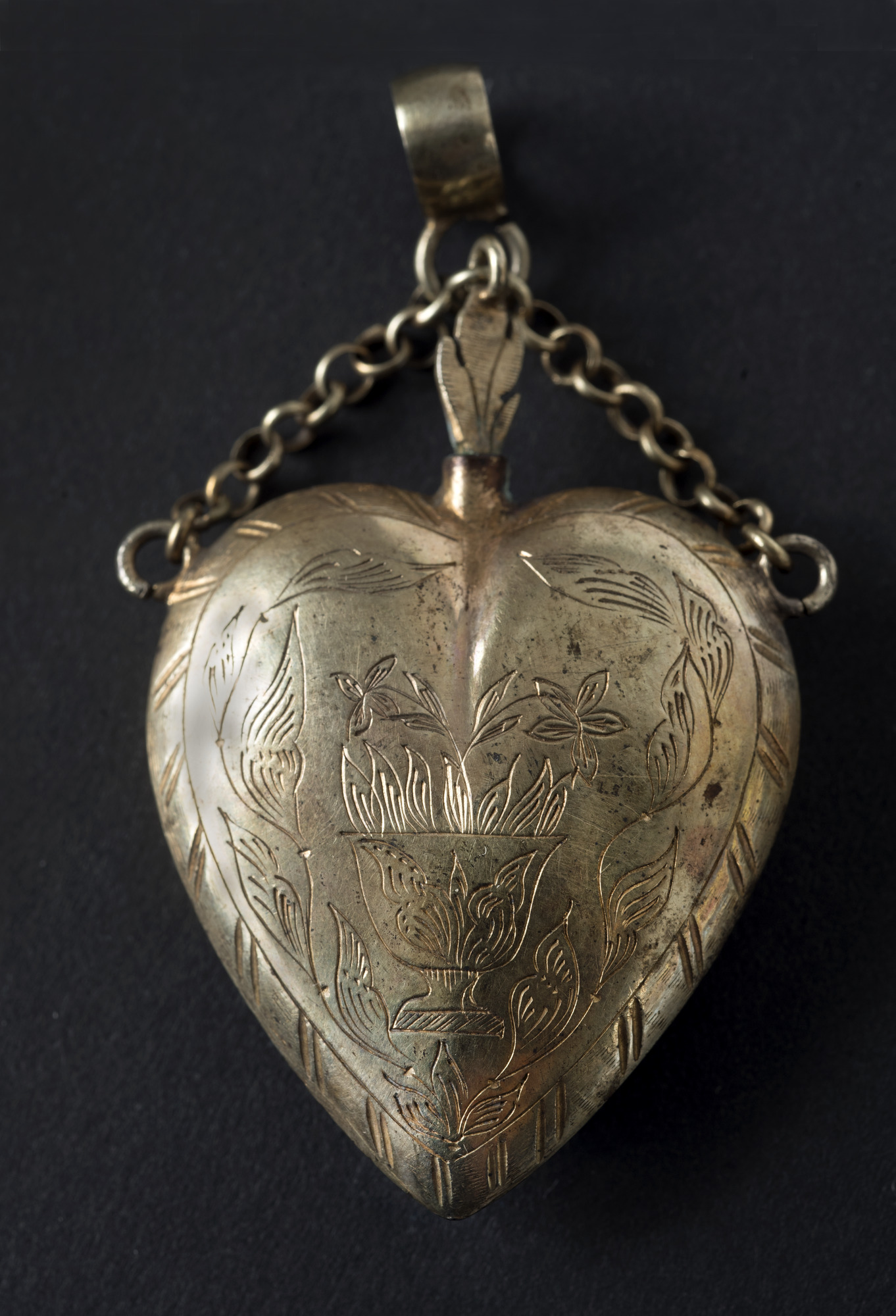 Hjärtformad luktdosa, 5 cm hög, som med två korta kedjor fästs vid en ögla. Proppen utformad som en brinnande låga. Hjärtats baksida med graverad enklare blomsterslinga samt stämplar, framsidan med mer komplicerat motiv med rurna elelr fat med lågor, omgiven av blomsterslinga och blad. Tillhörande kedja med runda länkar. Hjärtat, dekorta kedjirna och löparen förgyllda.