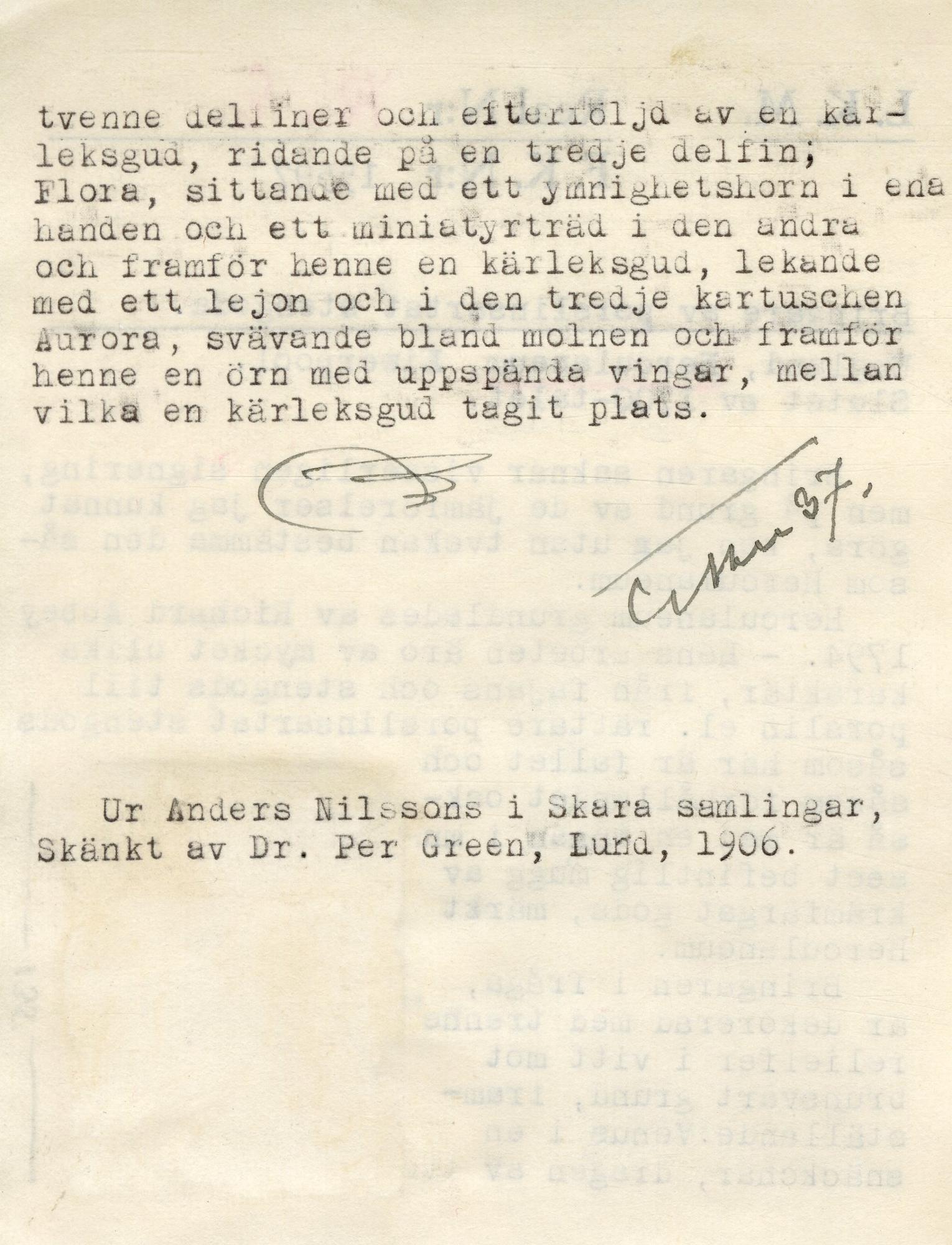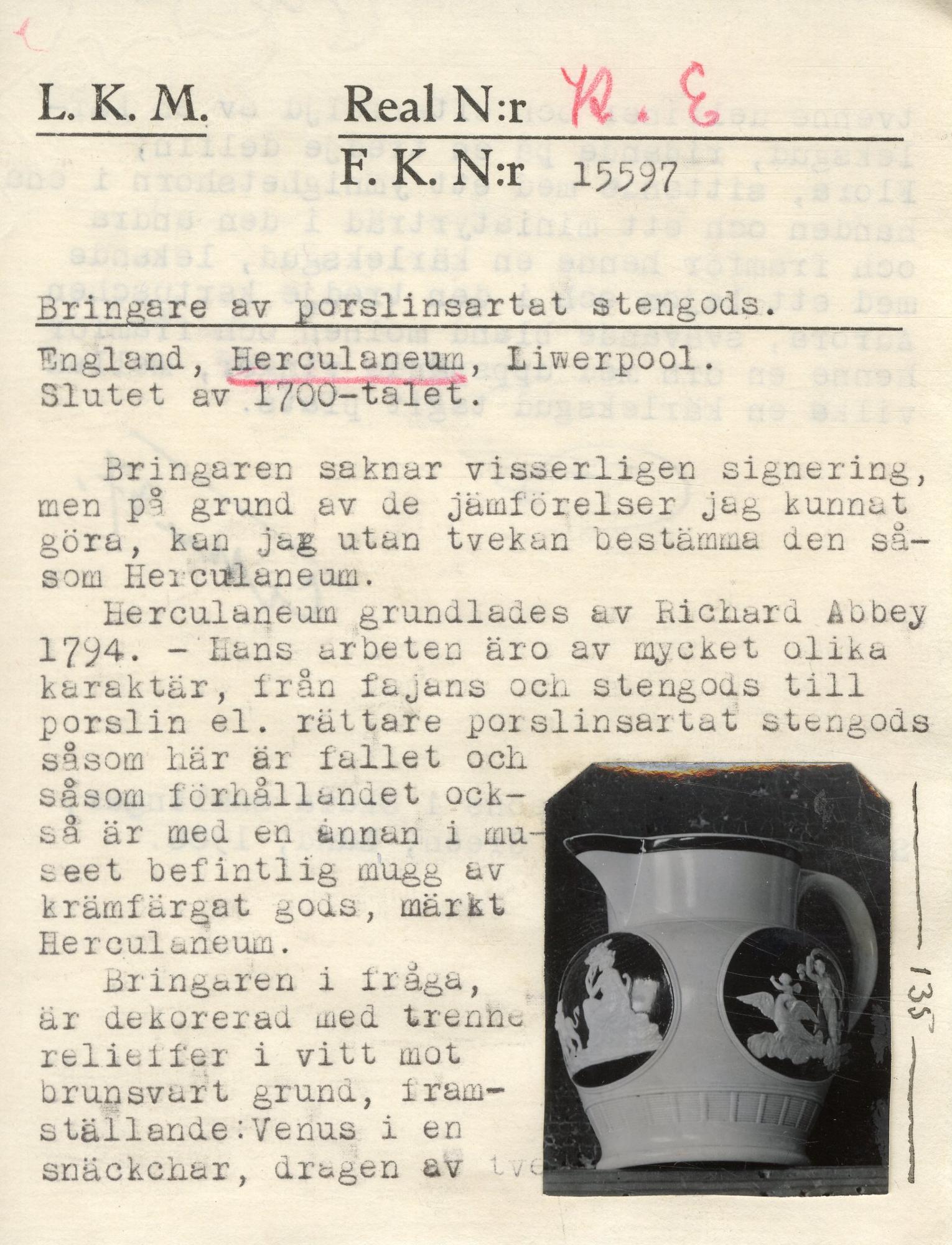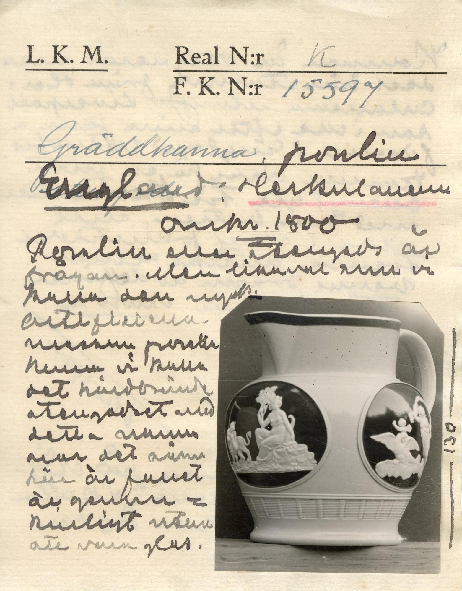 Uppköpt 1906 av G Karlin (på auktion) ur adjunkt Anders Nilsson i Skaras samlingar för 31.00 [KM 15596-15597]. Pengar till förvärvet skänktes av doktor Per Gren, Lund.; Tidigare katalogisering: oglaserat stengods. På den matta bisvitytan tre kartuscher med brun botten, mot vilka i relief framträder tre antika scener.