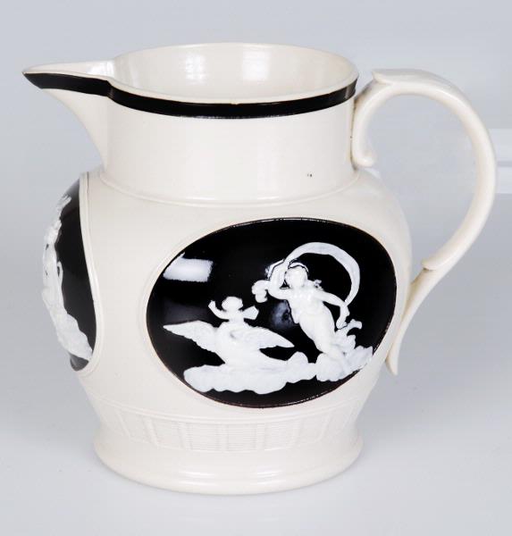 Med snås och lodhankel. Svartmålade medaljonger med figurscener i pålagd relief i vitt.