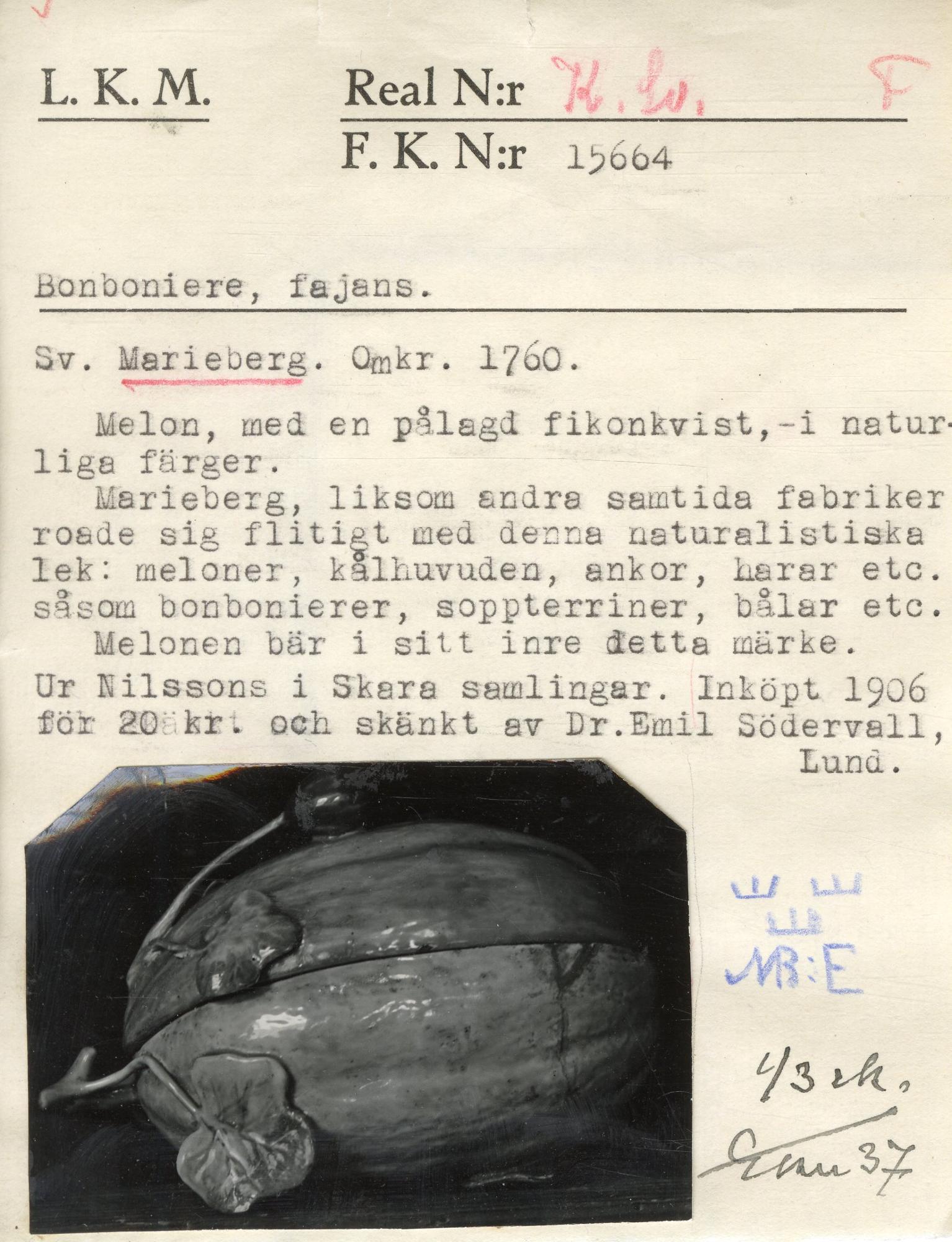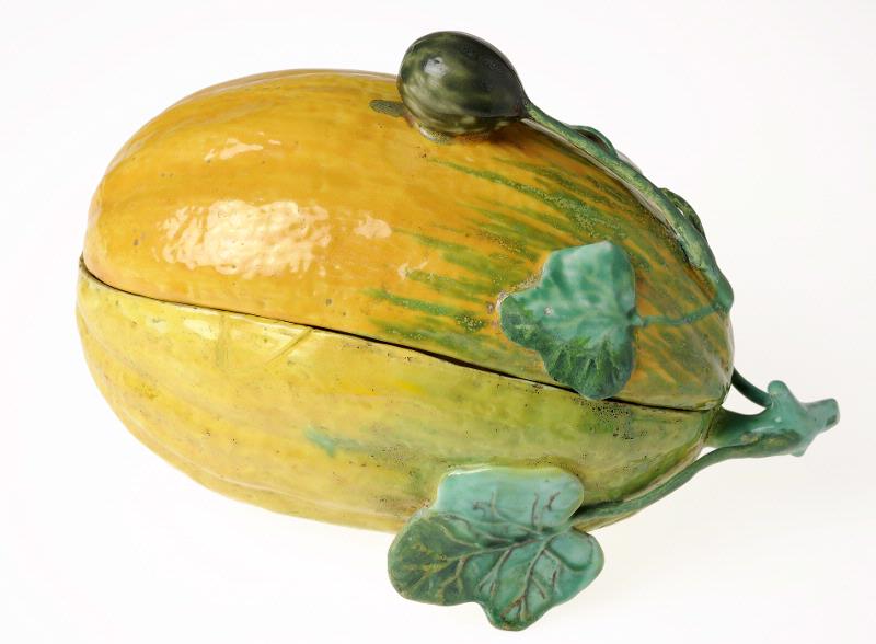Har melonens form och färg. Locket har något kraftigare gul färg än skålens, knopp i form av mörkgrönt fikon[?].