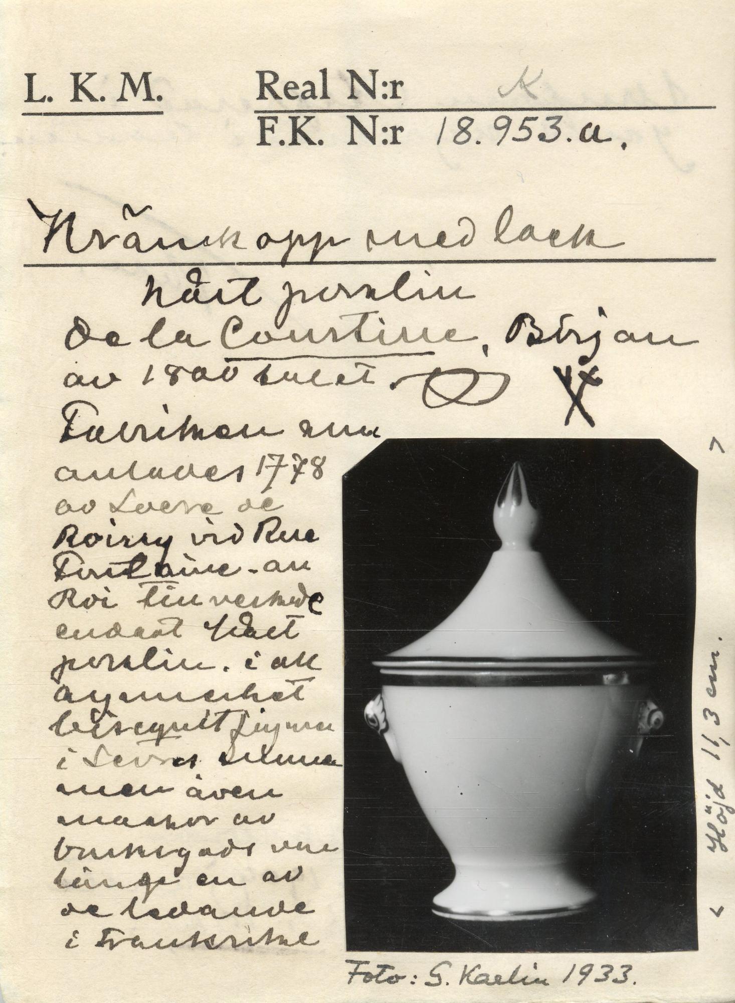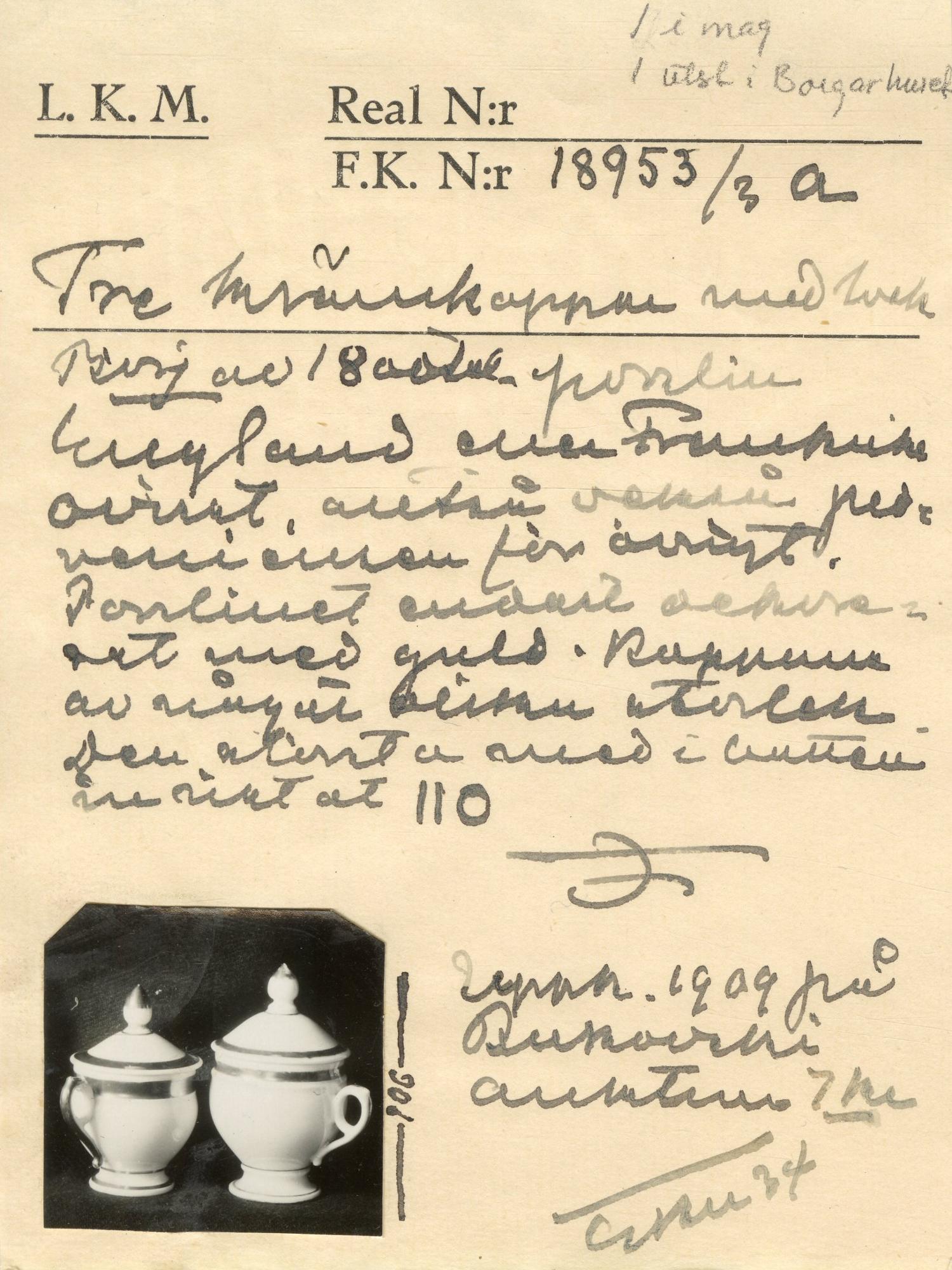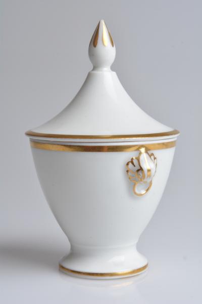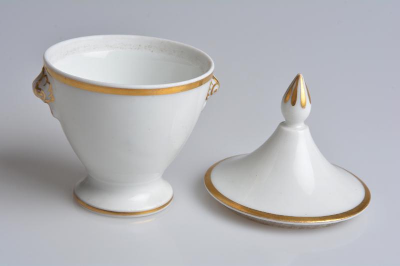 - Krämkopp. Urnformad, toppigt lock med spetsig knopp, dekor i guld. Två handtag i form av små lejonmaskaroner med gulddekor. [Vid inläggning i databas 1999-10 återfanns endast katalogkort för denna].