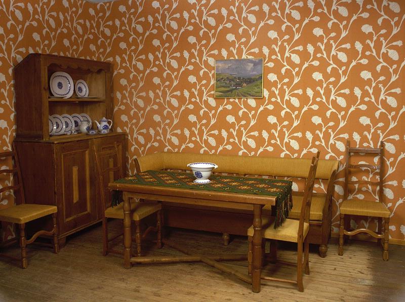 Brunbetsad furu. Ryggstöd och armlän med vertikala svarvade pinnar. Stoppad sits, armlän och ryggstöd klädda i fiskbensmönstrat gult linne. [mått saknas på katalogkortet]