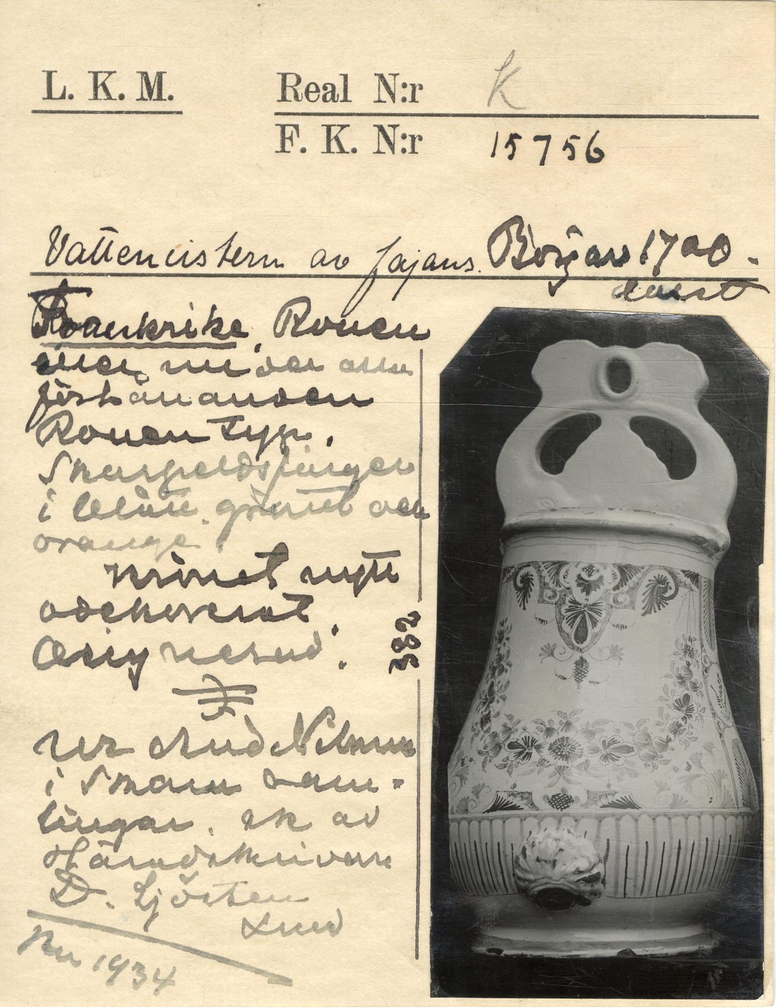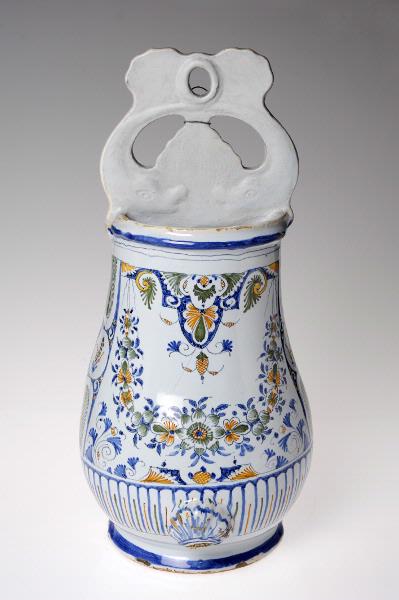 Dekor i blått, gult och grönt. Rekonstruerat överparti med delfiner i relief.