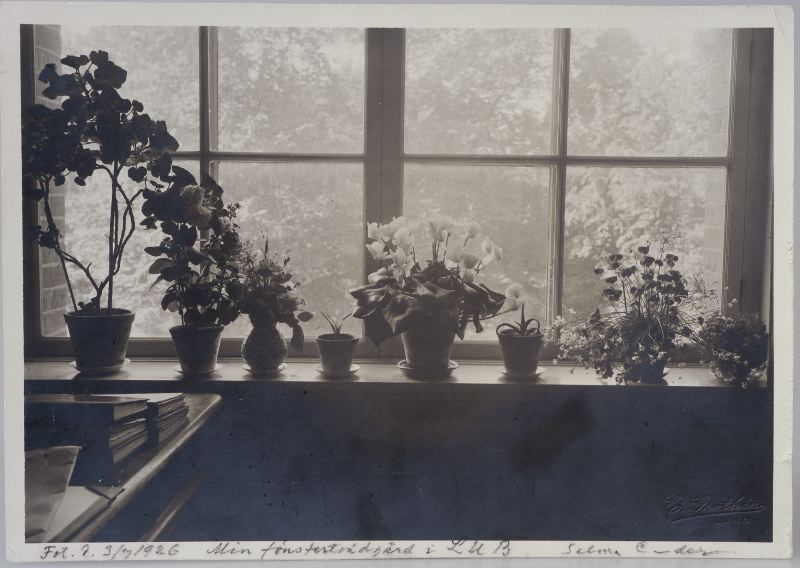 interiör föreställande ett fönster med flera krukväxter, text i blyerts undertill: Fot d 3/7 1926 Min fönsterträdgård i LUB. Selma Colliander