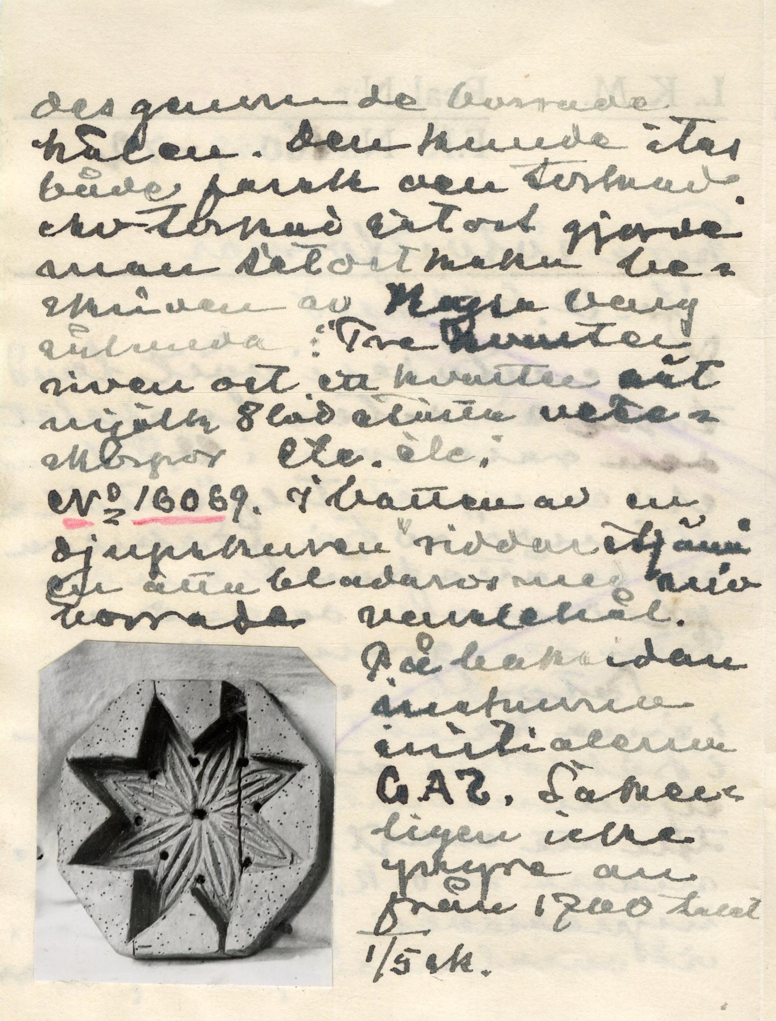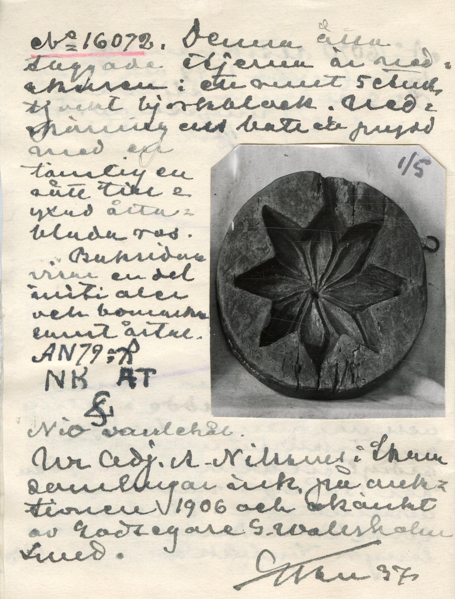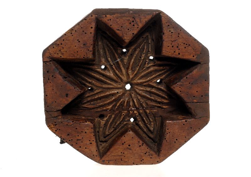 En åttauddig stjärnform utskuren ur ett block och i botten skuret en åttabladig blomma, nio borrade vasslehål. På baksidan initialerna GAS.