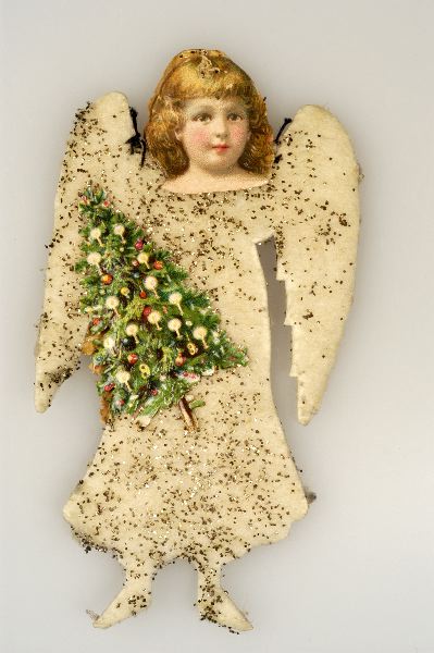 Ängel av bomullsfilt med bokmärkesansikte, blont hår; i handen håller hon en bokmärkesjulgran; guldstjärna; helt täckt med silverglitter.