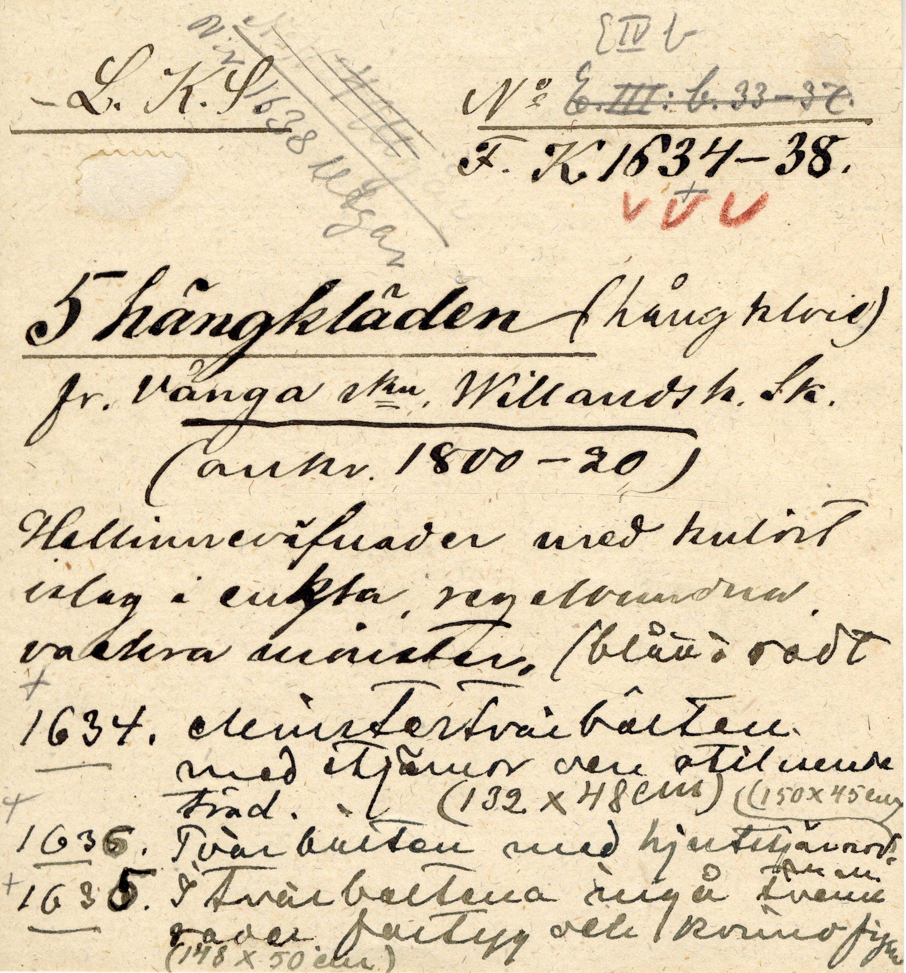 Vit. 6 mönsterbårder i rosa och blått. Märkt H med rosa korsstygn.