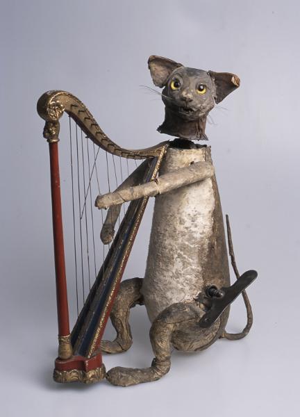 Naturtrogen katt av gips eller trä eller porslin, klädd med skinn. Katten spelar på en harpa av rödmålat och förgyllt trä med stålsträngar. Spelverket (dras upp med stor metallnyckel) är inbyggt i katten.
