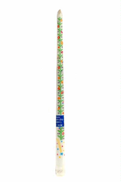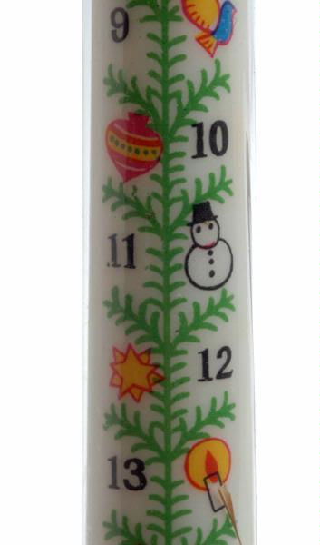 - vitt med grön julgranskvist, datum 1-24 och olika julmotiv i färg; förpackning av cellofan med texten Dinne candle Manufactured by Kameyama candle co ltd Kameyama city, Mie, Japan; prislapp 11:25