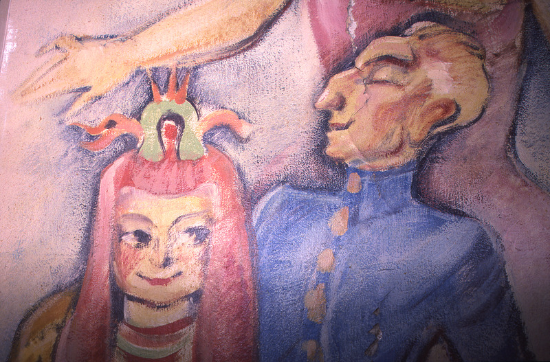 Lund. Svartbröder 18. Före detta matsal Hotell Ahlström. Målningar 194 med motiv ur olika lundaspex. Målningarna kom fram i samband med en renovering av lokalen och blev åter täckta med skivor.