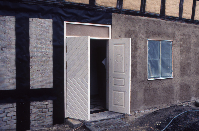 Lund. Kulturen 24. Lindforska huset. Gårdsfasaden. Nytillverkad ingångsdörr.