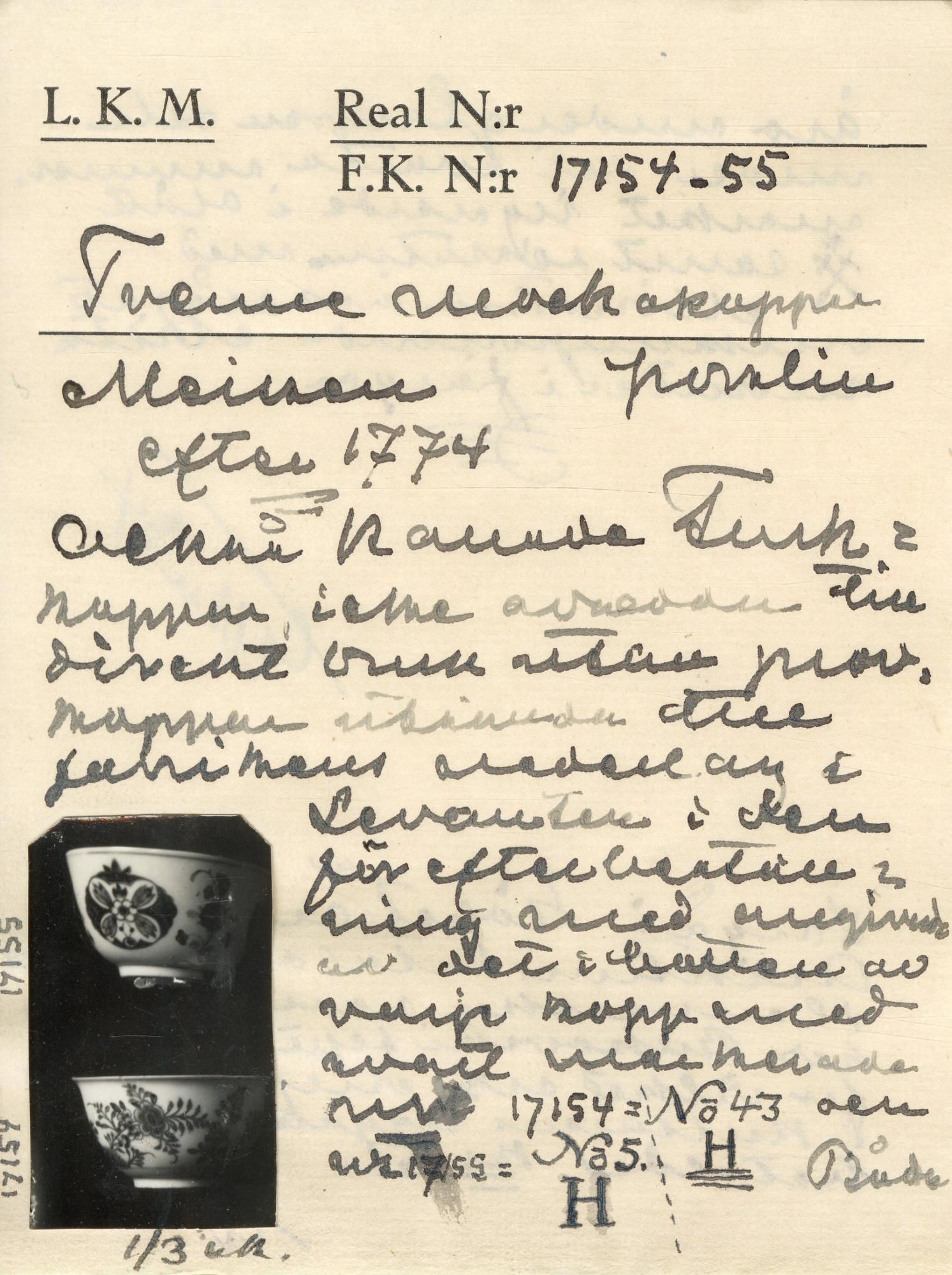 Enligt huvudliggare antagligen engelska Meissenimitationer; enligt katalogkort Meissen.