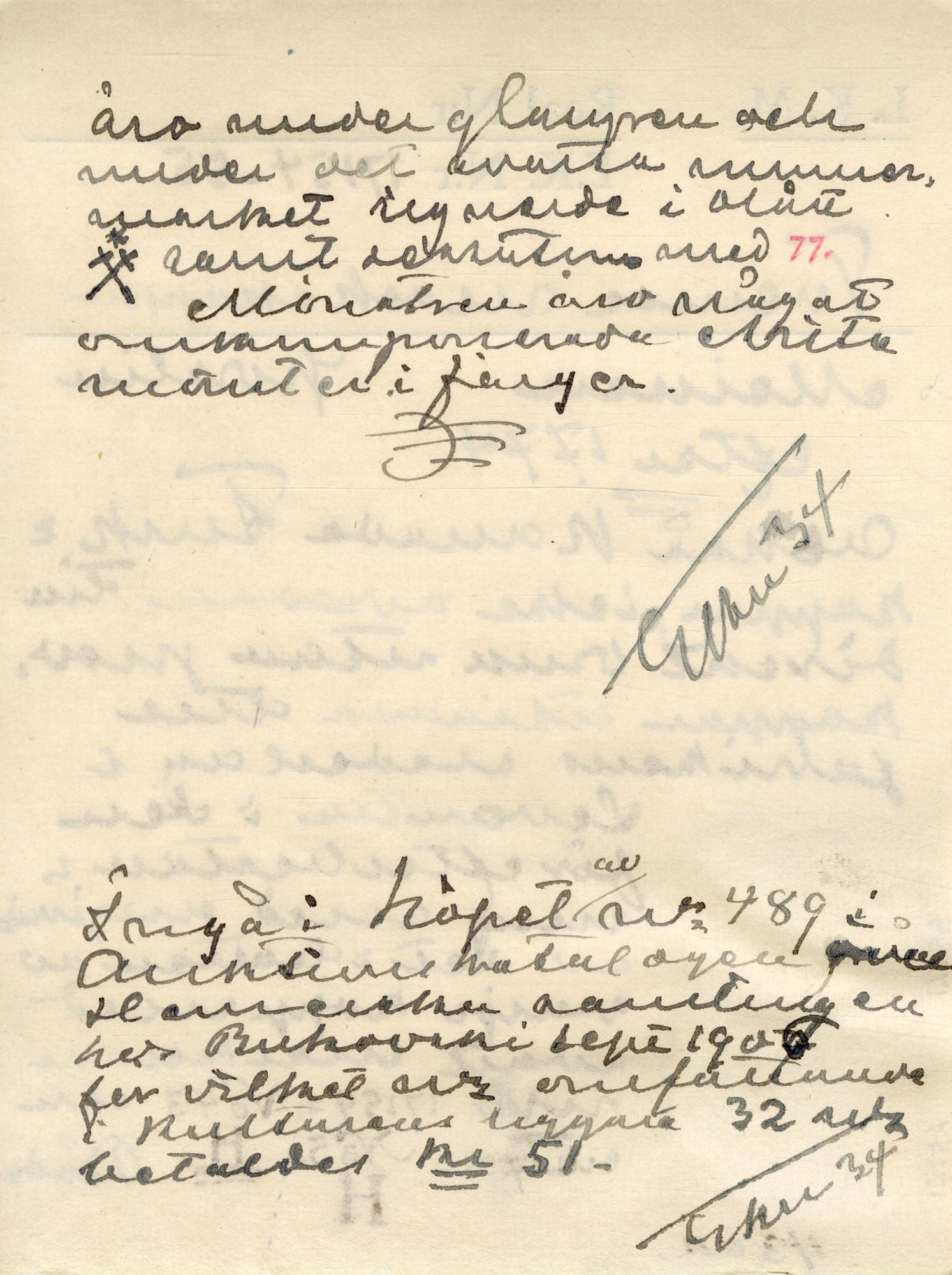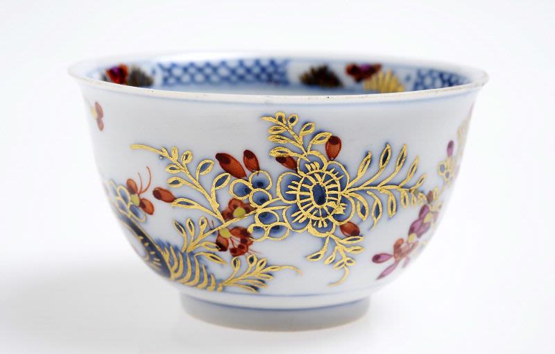 Turkkopp, rund bukig med målad dekor i blått underglasyr samt guld och järnrött över; mönster av blommor och blad. Varuprov med beställningsnummer i svart.