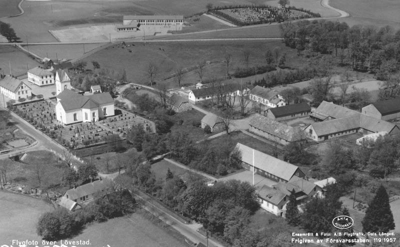 Överst tiil höger finns den Lövestads Nya Kyrkogård, anlagd i början av 1910-talet.
