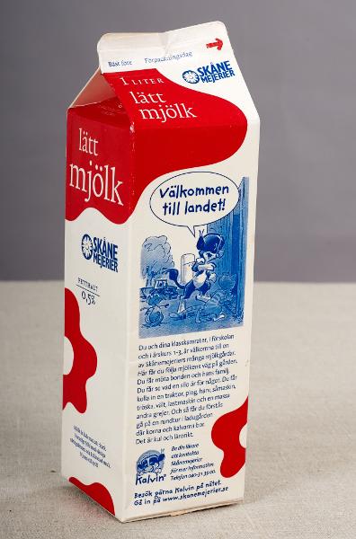 färgad kartongförpackning. Hög med kvadratisk bas. Kartongens topp som också är öppningen är formad som ett sadeltak. Röd med text; Välkommen till landet. Lättmjölk 0,5 %