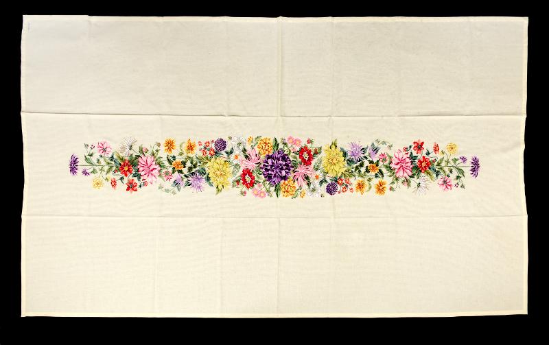 - Duk, textil, broderat. Duken blev färdig 2016, men Maria Quensel höll på med den länge. Märkt i ena hörnet med lila garn; "MQ 2016". [Duken finns avbildad på sida 19 i katalogen med KM 99227].