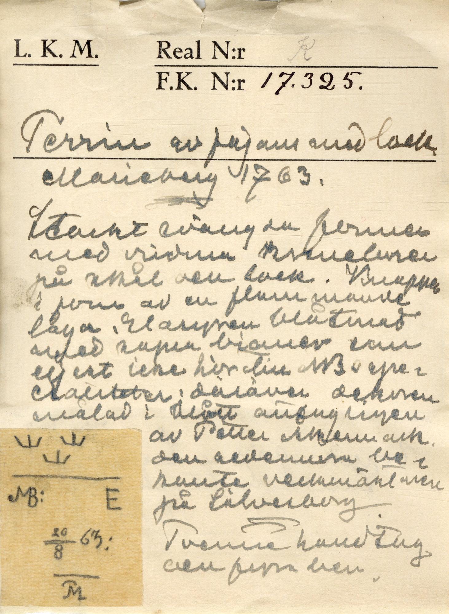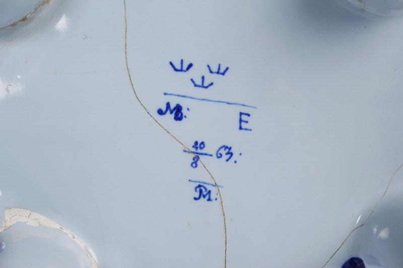 - Står på fyra ben och har öronen formade till bladkartuscher. Ljust blå tennglasyr, bemålad med ströblommor i skarpt blått och bianco sopra bianco. Locket är högt och har en eldslåga, målad i blått, som knopp.