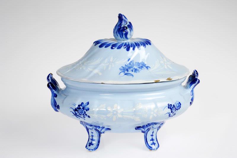 Står på fyra ben och har öronen formade till bladkartuscher. Ljust blå tennglasyr, bemålad med ströblommor i skarpt blått och bianco sopra bianco. Locket är högt och har en eldslåga, målad i blått, som knopp.