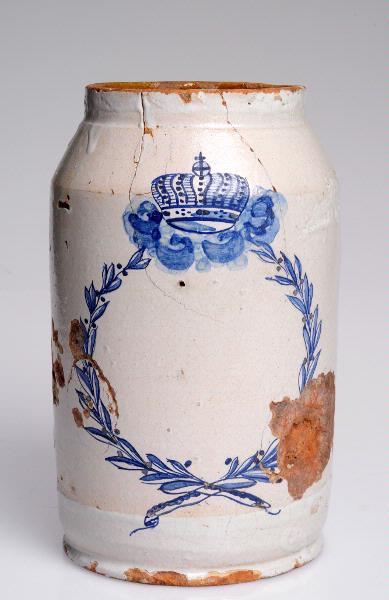 Gulvitt lergods. På yttersidan gråvit glasyr, inuti gulglaserat. Dekor i camïeu bleu.