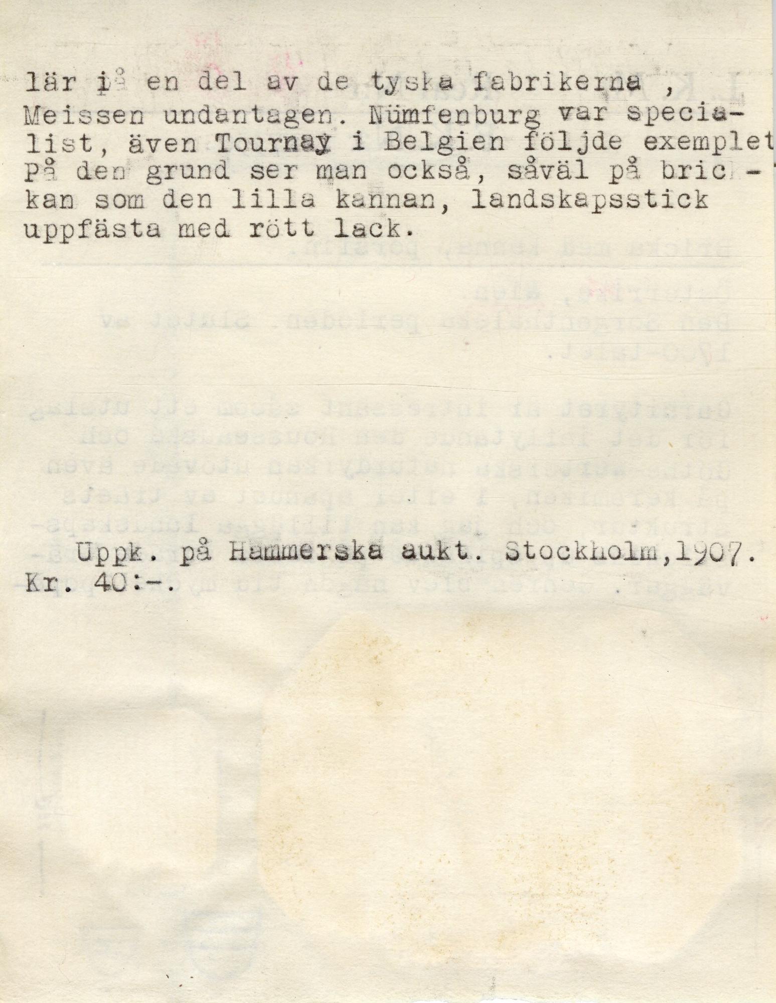 - Genombruten kant med guldstoffering; målad träådring i brunt och utsparat rektangulärt fält i mitten med landskapsmålning i sepia. Målningen signerad nedre vänstra hörnet: G. Aberli.Del. i mitten: No.i2. samt i nedre högra hörnet: J. Hertz.s.