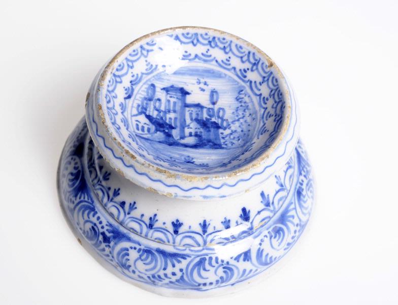 Vit glasyr med blå dekor. Husmotiv i saltbehållaren.