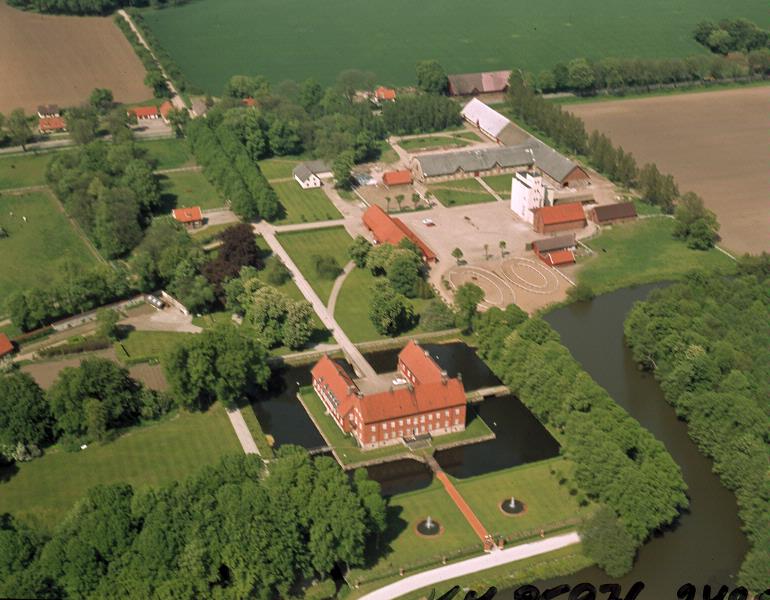 - Flygbild. Slottbebyggelse, själva slottet som är målat i rött, är byggt på ett kvadratiskt område som i sin tur är avgränsat av en vallgrav, som i sin tur bildar ytterligare en kvadrat. Formell trädgård samt omgivande park. I bildens nedre högra del syns en krök i Kävlingeån. Längre upp till höger i bild syns stallar och ekonomilängor. En väg går lite snett tvärs över bildens övre del. Längs med vägen hus och från vägen infart med allé mot slottet.