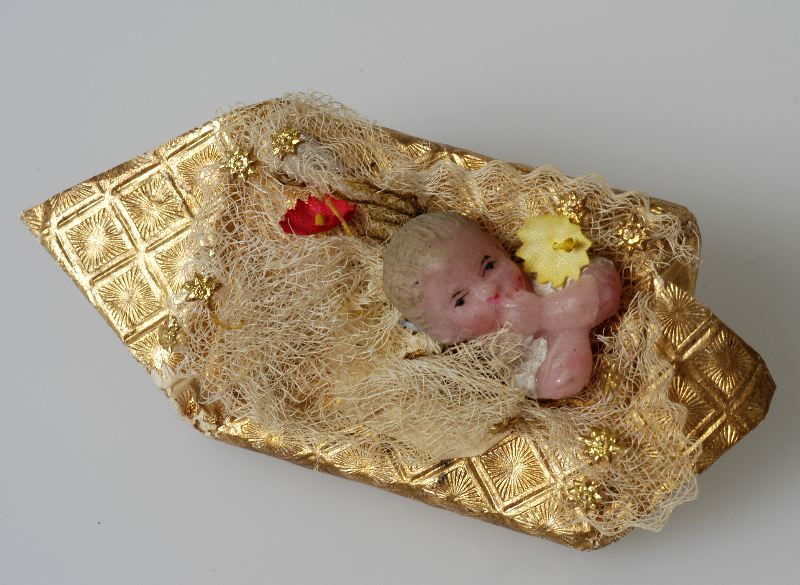 präglat guldpapper med dekor av tyll, konstgjorda blommor och ett barnansikte i konstmaterial