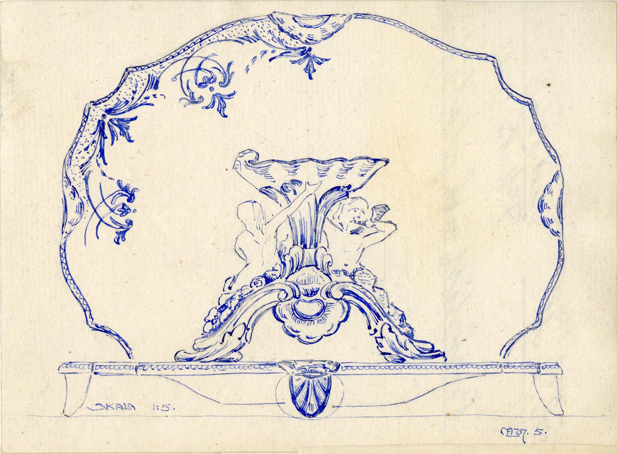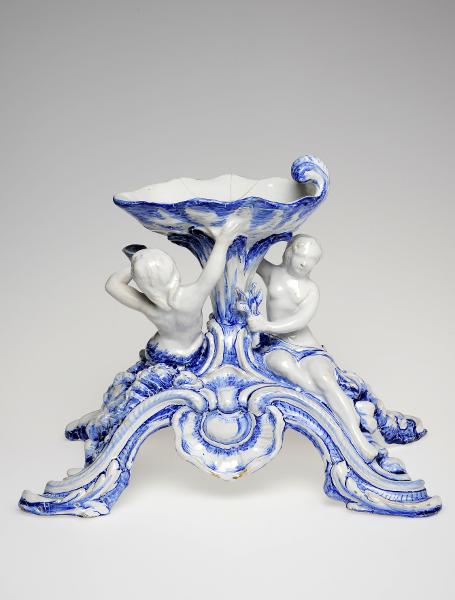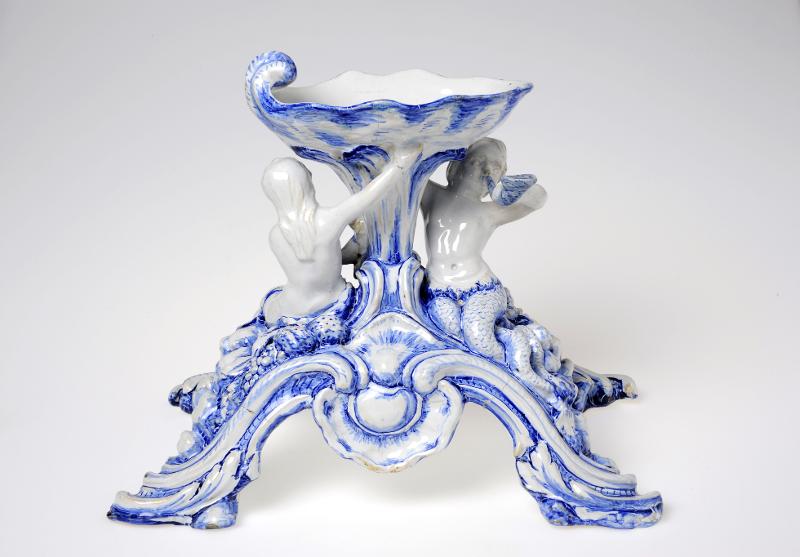 Överst en snäcka som lyfts av en kvinna och en sjöjungfru tillsammans. Blåmålad dekor troligen av Daniel Hillberg. Formgivningen är troligen utförd av Christian Precht.