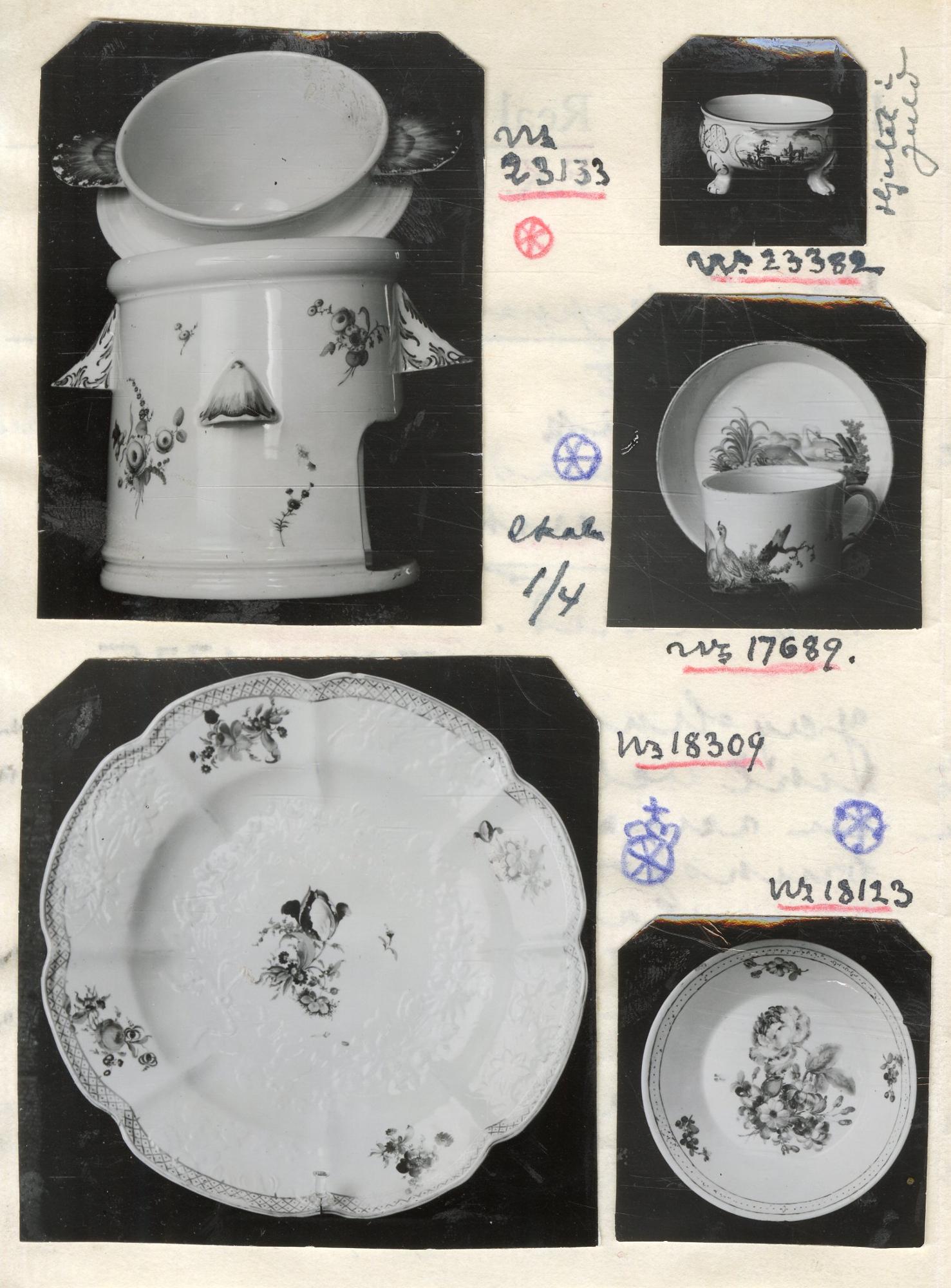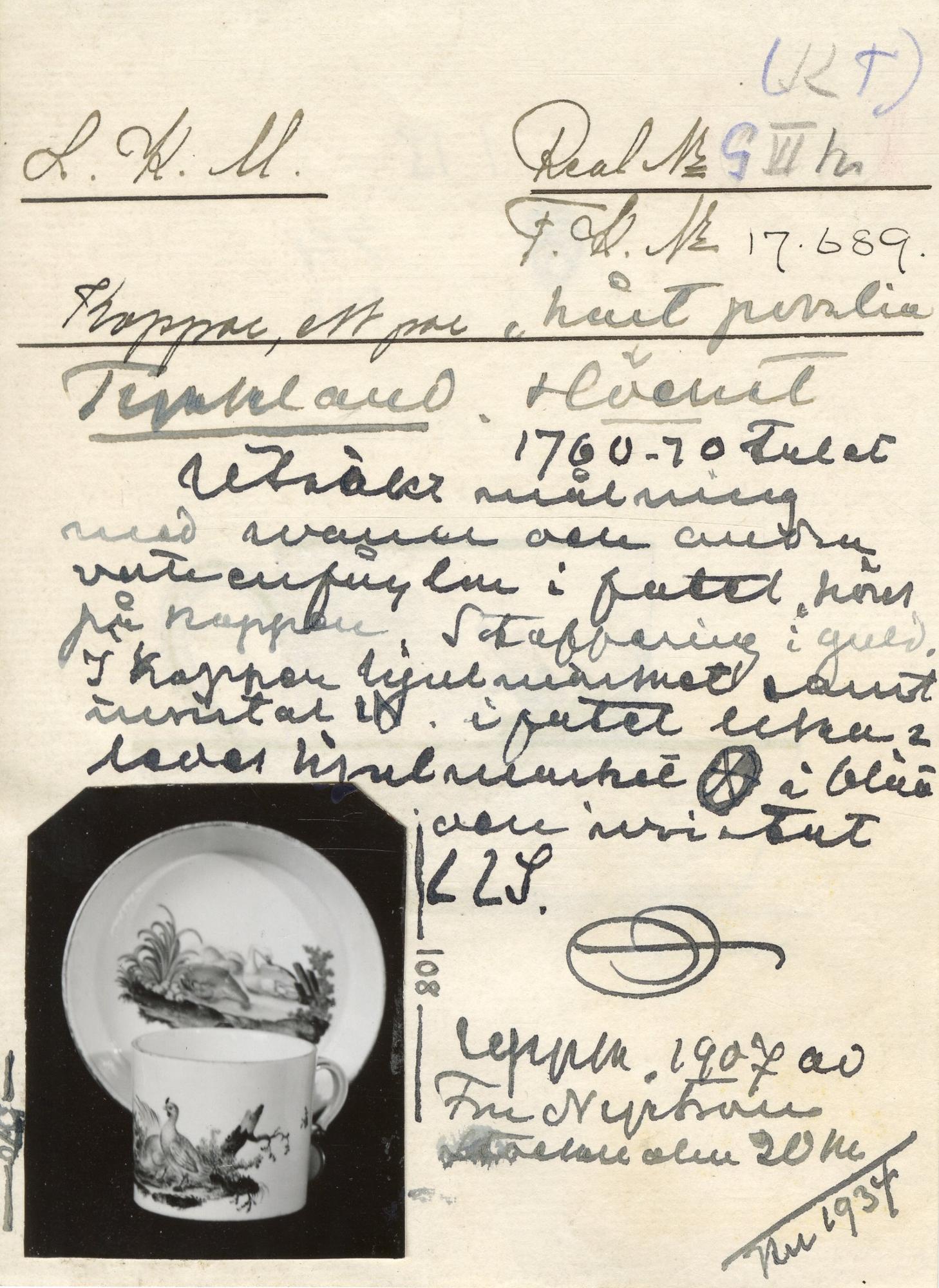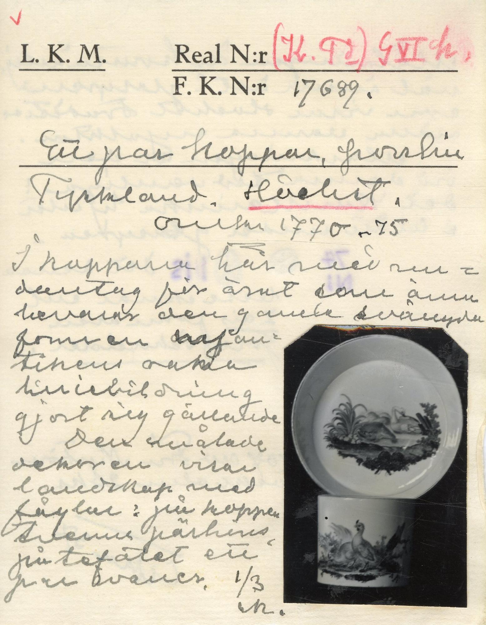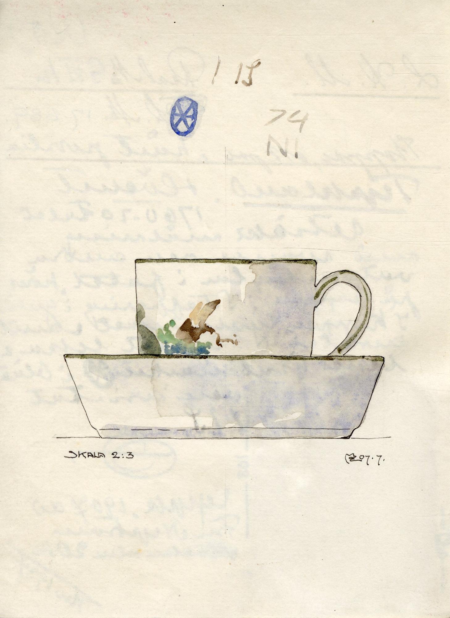 i blått under glasyr i såväl kopp som fat, hjulet med sex ekrar, inpressat i kopp IN, inristat i kopp 74, respektive i fat [avbildat på katalogkort]