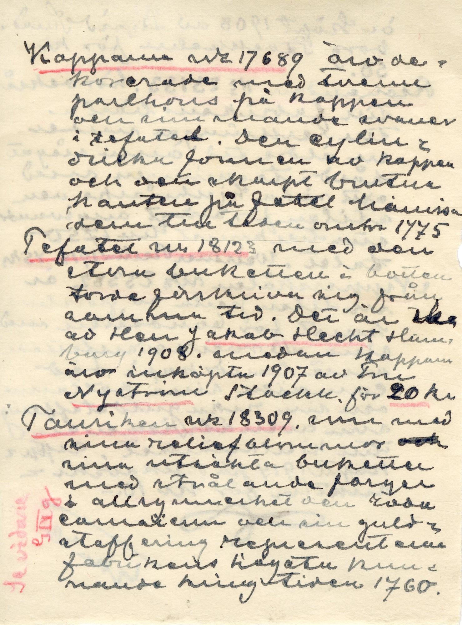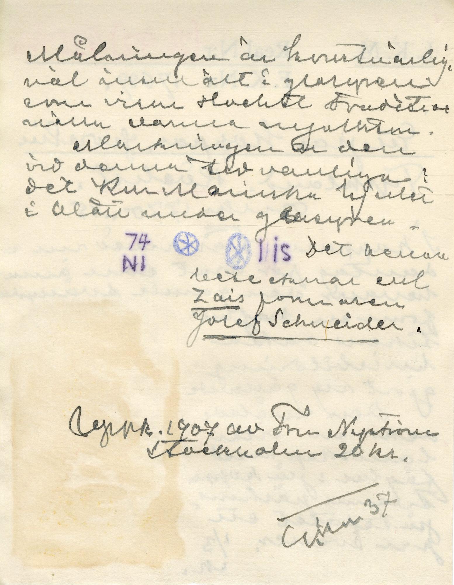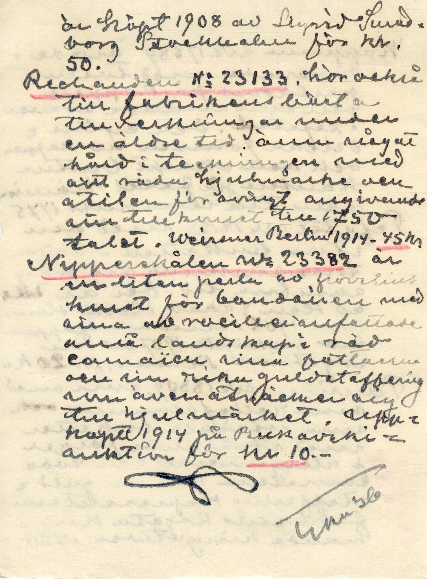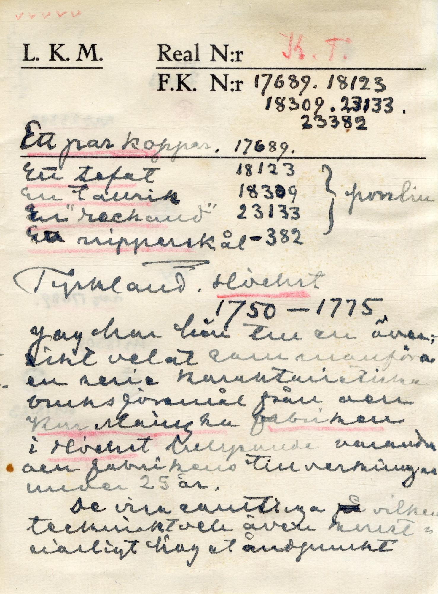 i blått under glasyr i såväl kopp som fat, hjulet med sex ekrar, inpressat i kopp IN, inristat i kopp 74, respektive i fat [avbildat på katalogkort]