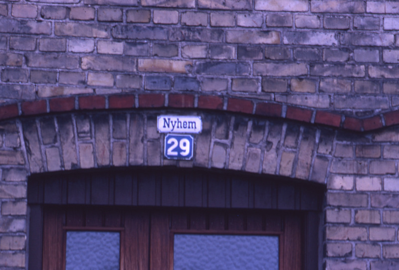 Lund. Hälsobrunnen 16. Namnskylt över dörr, "Nyhem".