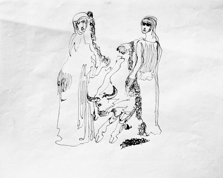 kvinna; man; museiföremål; tjur
