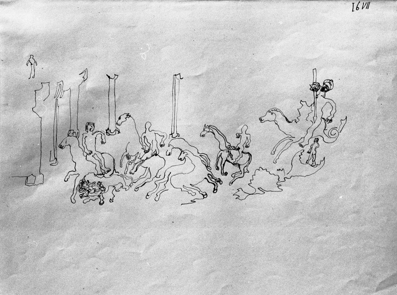 djur; häst; man; museiföremål; ruin; ryttare; spjut