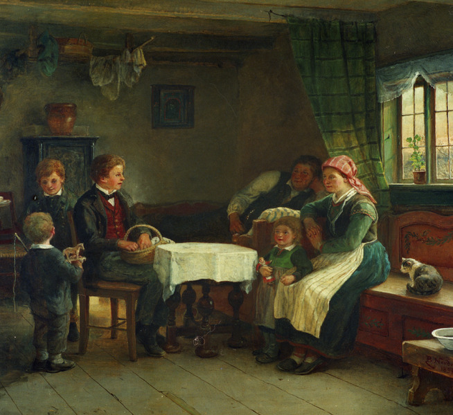 barn; katt; kvinna; man; oljemålning; pojke; stuginteriör; familj