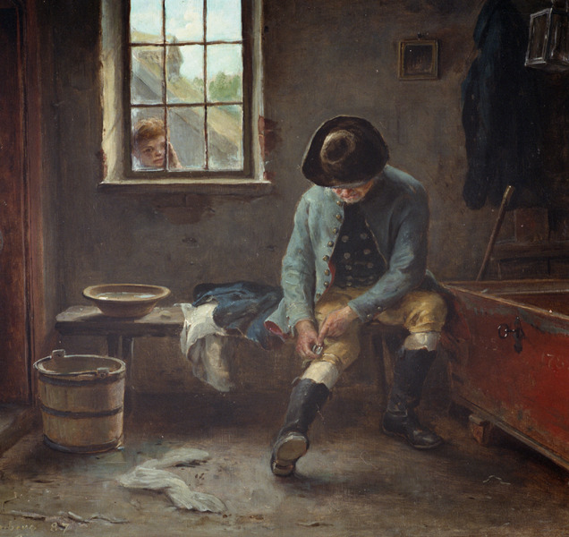 barn; interiör; man; oljemålning; pojke; säng